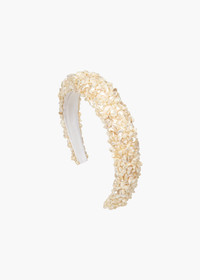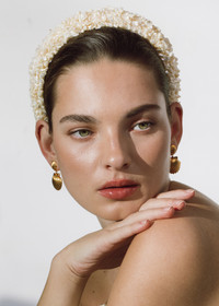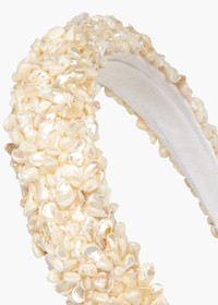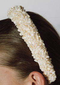 Pearls are a natural a wonder that endlessly capture our imagination, and the Delmar Headband is our ode to their intrinsic magic. Embroidered by hand in our Brooklyn studio, the headband is blanketed in natural pearls, showcasing their sublime iridescence. This statement headpiece also prioritizes comfort, with a flexible headband base and grosgrain-lined interior. Dimensions: 1 inch width, 1 inch height Material The Delmar Headband is made by hand in New York from hand embroidered pearls on silk and lined in grosgrain to ensure ultimate comfort and promote hair health. We recommend storing headbands in their dust bag while not in use. Avoid contact with water, perfume, and other chemicals, including hairspray, which should be used only before placement in the hair.