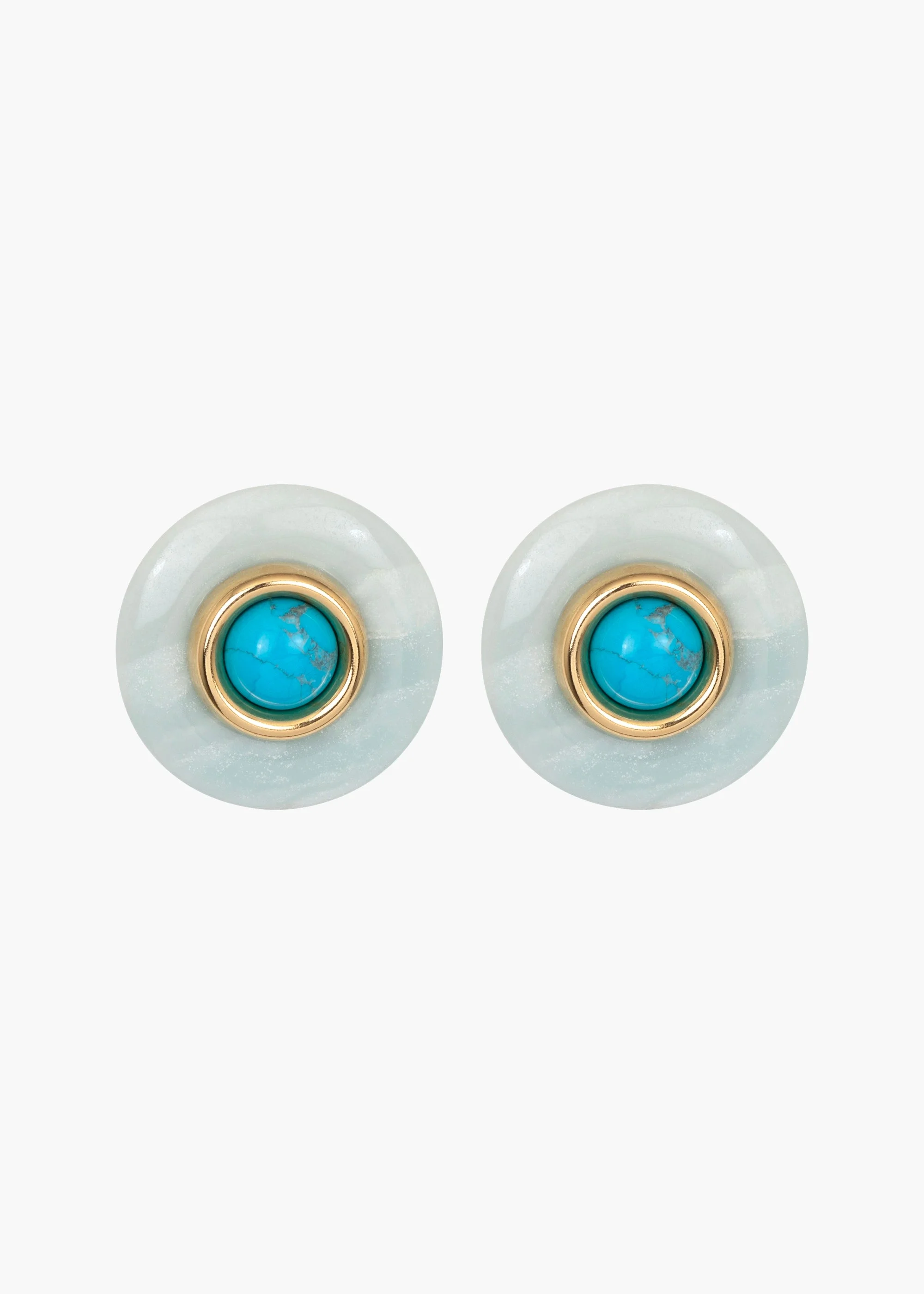 The Devon Earrings are entirely crafted of semi-precious gems, including turquoise, amazonite, and carnelian— stones known for their powerful metaphysical properties. A modern spin on a vintage 1980s button earring crafted by hand in New York, the polished gemstones are accompanied by an 18-karat gold-plated bezel. Since each stone is forged by nature with organic variations, each earring is one-of-a-kind. Dimensions: 1.25" Material The Devon Earrings are made by hand in New York from blown glass, natural semi-precious stone, and 18K gold plated brass. All stones have natural variances in color and markings that make each one unique. They have a surgical-steel post, are nickel-free and safe for sensitive skin. We recommend storing earrings in their dust bag while not in use, and avoiding contact with water, perfume, hairspray, and other chemicals.