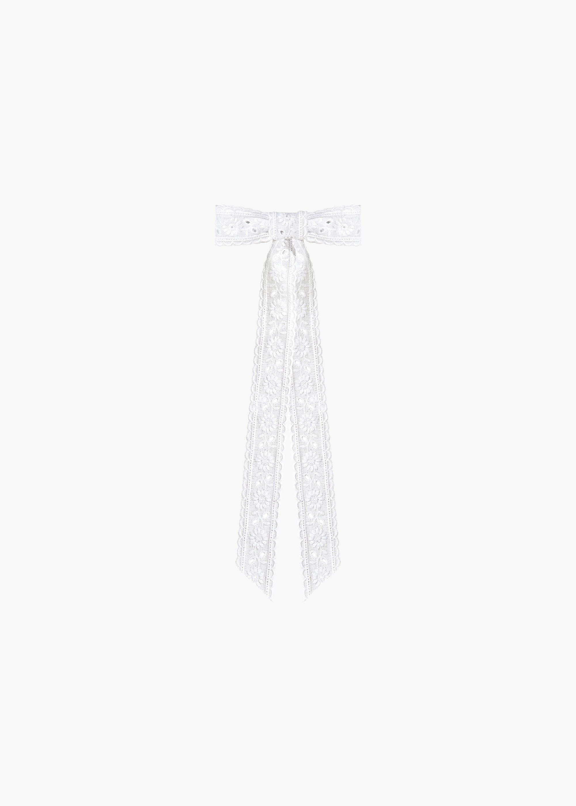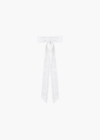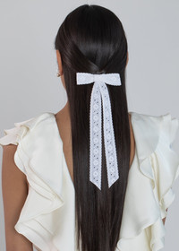 White eyelet is a harbinger of brighter days, and the Dolly Bow Barrette incorporates the romantic lace into any look. The eyelet ribbon is embroidered with a floral motif, emphasized by the intricate cutwork. Made by hand in New York, each bow is mounted on an automatic French barrette closure, for easy and secure placement. Dimensions: 4 inch width, 11 inch length Material The Dolly Bow Barrette is made by hand in New York of lace ribbon and finished with a steel French barrette closure. We recommend treating this bow as you would a piece of jewelry, and storing in the dust bag when not in use. Avoid contact with water, perfume, and other chemicals, including hairspray, which should be used before placement in the hair.