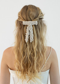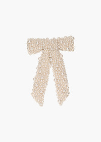 The Donna Bow Barrette is a scene from our pearly dreams — a small bow which has been embroidered allover with pearls of varying sizes, to create a sea-inspired, ethereal finishing touch. Each bow is meticulously sewn by hand in our Brooklyn studio, and features a French barrette closure, making it easy to wear a multitude of ways: in the back of the hair, swept to the side, above a ponytail, and more. Material The Donna Bow Barrette is made by hand in New York of pearl embroidery, with a steel French barrette closure. We recommend treating this bow as you would a piece of jewelry, and storing in the dust bag when not in use. Avoid contact with water, perfume, and other chemicals, including hairspray, which should be used before placement in the hair.