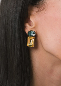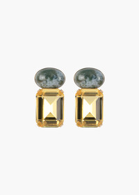 A masterclass in mixed media, the Elin Earrings combine fine Austrian crystals with semi-precious gemstones, in unexpected pairings of color and form. With beautiful natural variations that make each pair unique, the semi-precious stones are hand-sorted and individually matched in pairs, while the emerald-cut crystals loan a vitality and shimmer to the natural stone, bringing out its liveliness. Made by hand in New York, the subtle 18-karat gold-plated setting similarly allows the stone's beauty to shine uninterrupted. Dimensions: 1 1/8in x 1/2in Material The Elin Earrings are made by hand in New York from 18K gold plated brass, natural semi-precious stones, and Austrian crystals. All stones have natural variances in color and markings that make each one unique. They have a surgical-steel post, are nickel-free, and safe for sensitive skin. We recommend storing earrings in their dust bag while not in use, and avoiding contact with water, perfume, hairspray, and other chemicals.