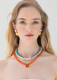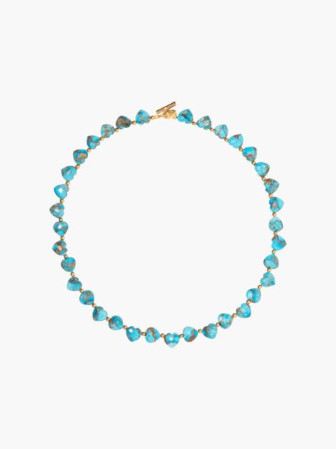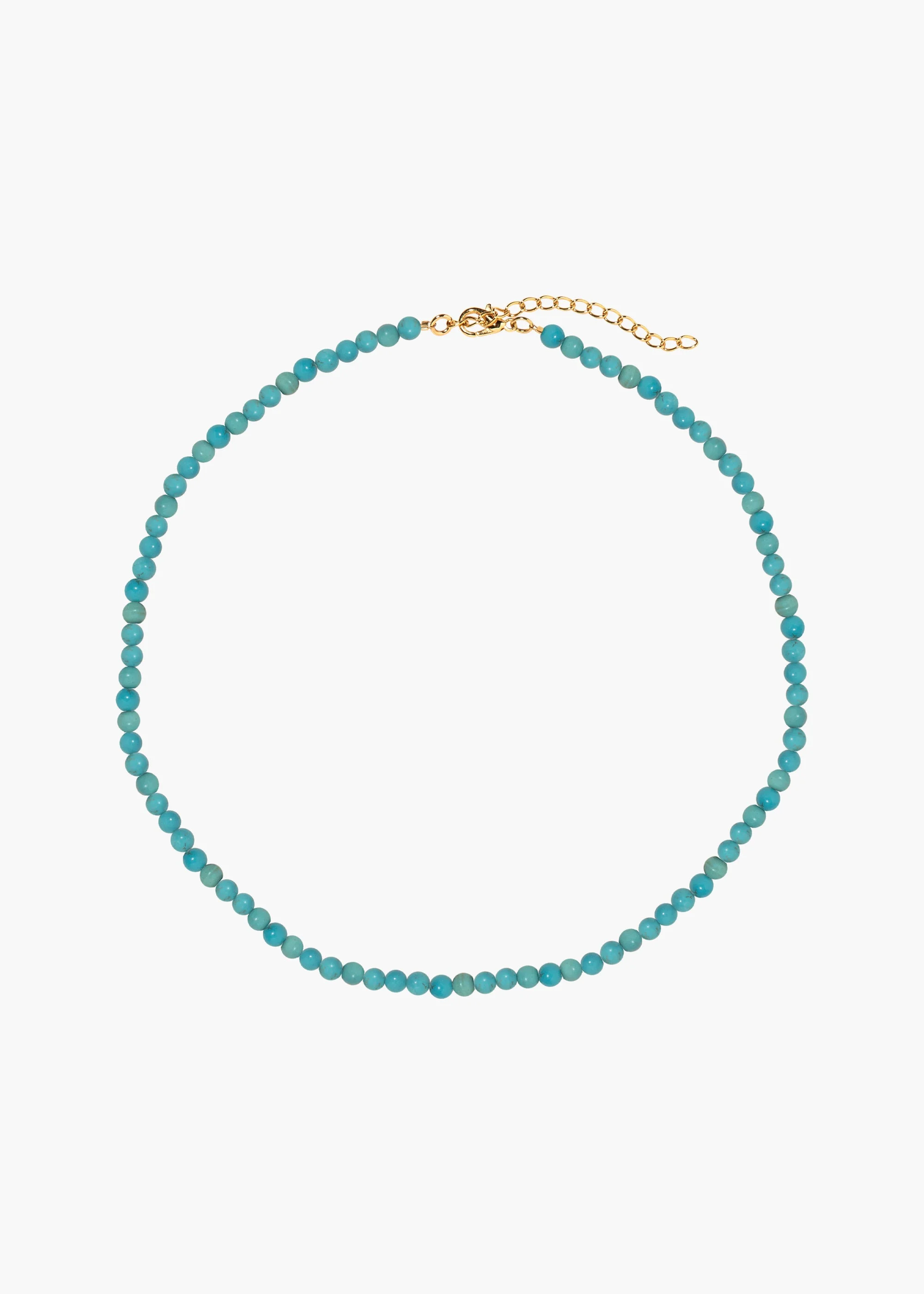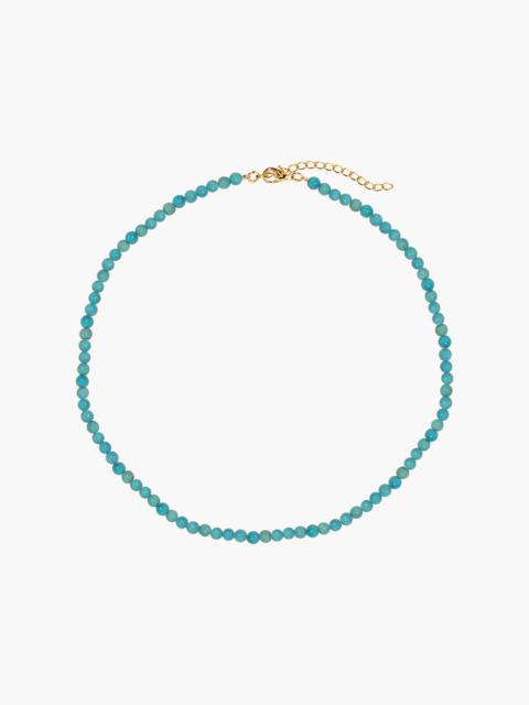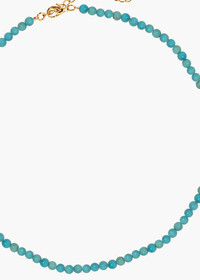 The Ersa Necklace is hand-beaded with semi-precious turquoise stones, forming the ultimate layering piece. Turquoise has been revered for centuries as a stone of protection, said to promote healing and bring success. This necklace is designed to be mixed and stacked with other pieces in our Semi-Precious Collection; the extender at the clasp makes it easy to adjust and achieve the desired length, especially when layering with other necklaces. Dimensions: 16" length with 2" extender Material The Ersa Necklace is handmade in New York of semi-precious stones. Our jewelry is nickel-free and safe for sensitive skin. We recommend storing jewelry in its dust bag while not in use, and avoiding contact with water, perfume, hairspray, and other chemicals.