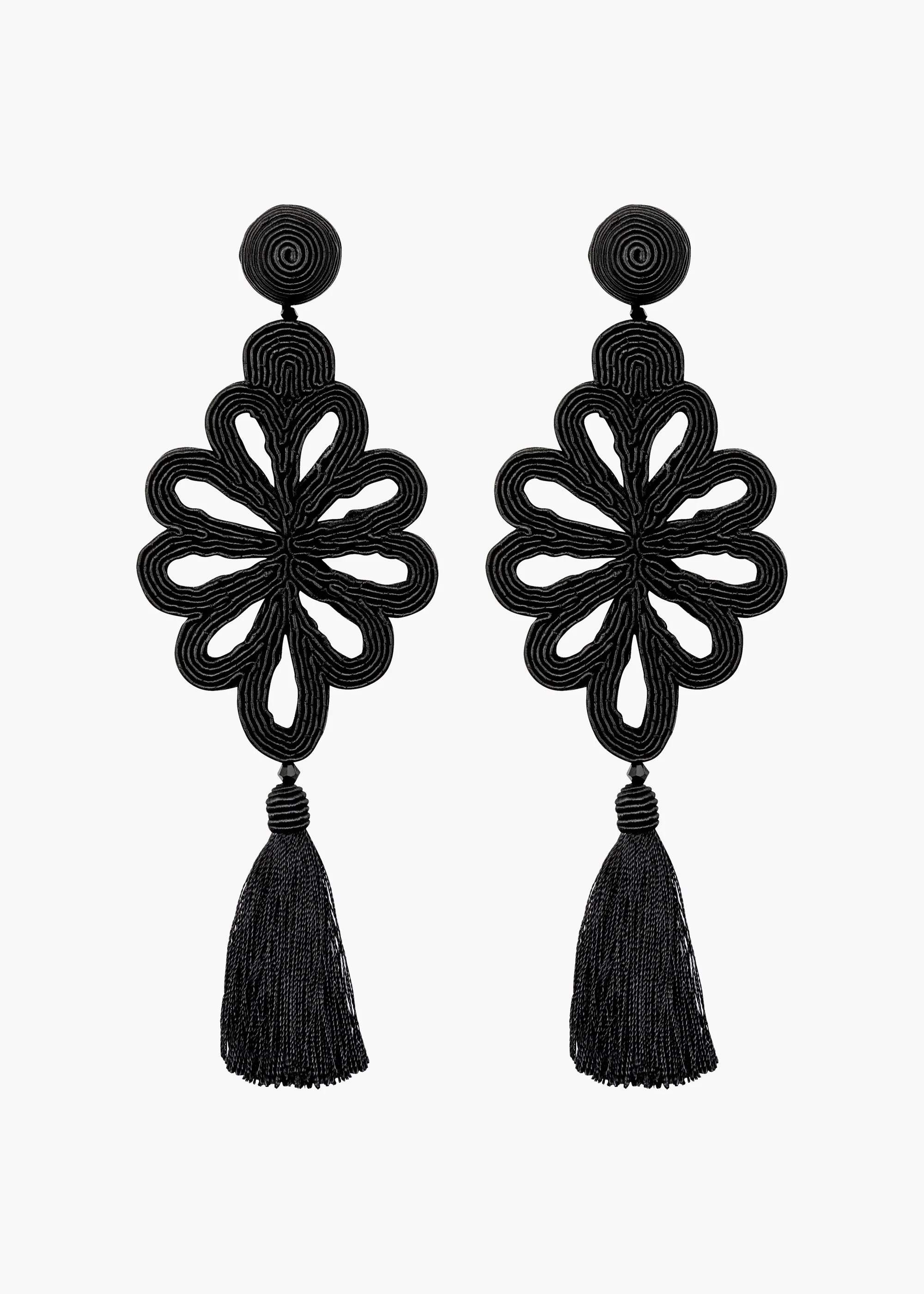 The Esperanza Earrings are a striking, shoulder-grazing conversation piece, made by hand in New York. Hand-corded with silk and finished with tassels, the movement makes them even more fun to wear. Despite their magnificent scale, these earrings are exceptionally lightweight and comfortable to wear. Dimensions: 6" length Material The Esperanza Earrings are made by hand in New York from hand-embroidered silk tassel embellishments and 18k gold plated finishings. They have a surgical-steel post, are nickel-free and safe for sensitive skin. We recommend storing earrings in their dust bag while not in use, and avoiding contact with water, perfume, hairspray, and other chemicals.