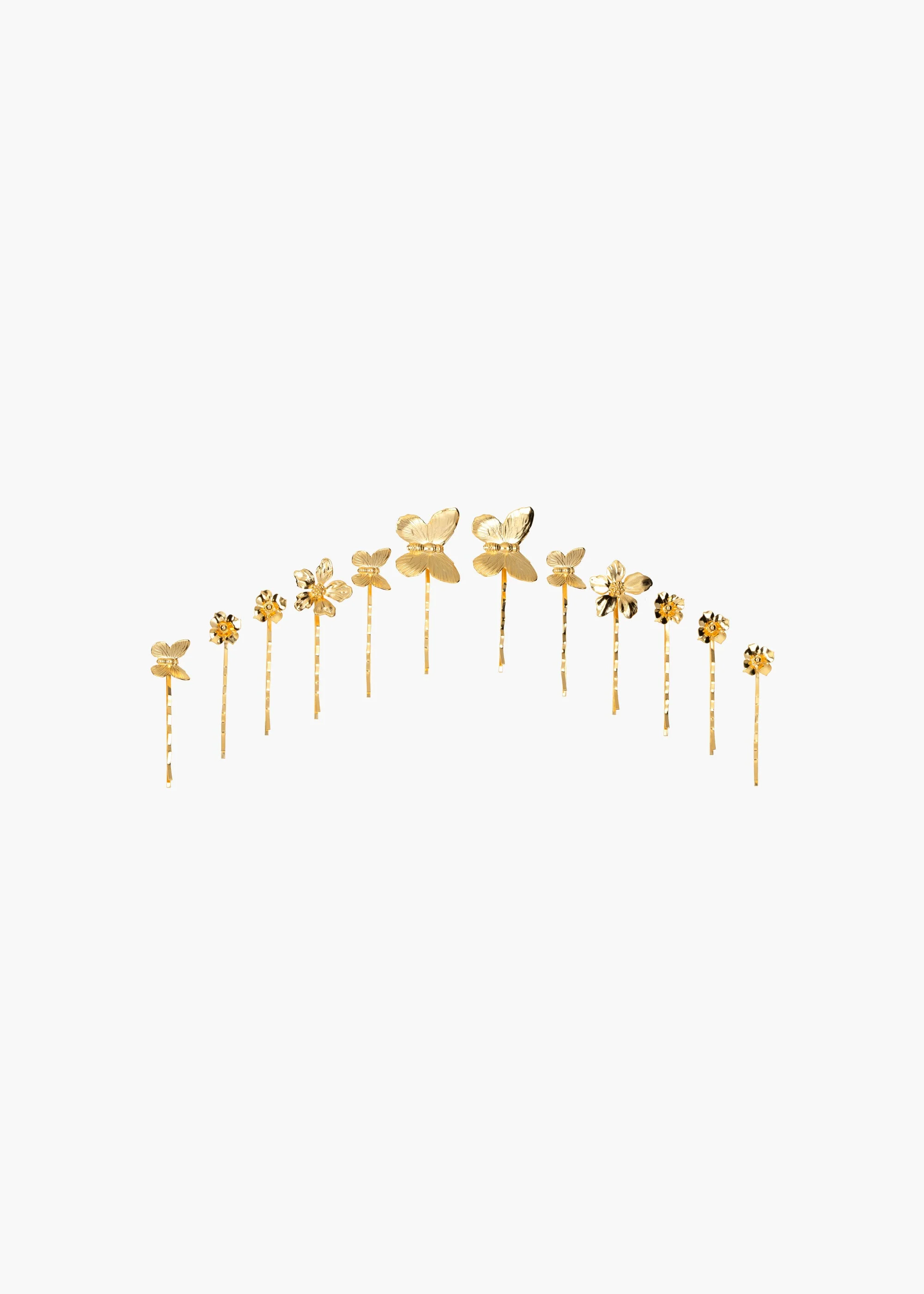 A set of twelve, the Farasha Bobby Pin Set features butterflies and an array of flowers, which together form an idyllic garden scene, all plated with 18-karat gold. The pins can be left exposed, or tucked in the hair to show only the butterflies and flowers. This set can be worn in smaller groups, or scattered en masse and mixed with the Alanis Bobby Pin Set, combining different flowers like a bouquet; add the coordinating Hilda Earrings to complete the set. Dimensions: Largest Pin: 1” in height, 1.25” width, 2" length. Smallest Pin: 0.5” height, 0.5” with, 2" length. Material The Farasha Bobby Pins are a set 12, made by hand in New York of 18k gold-plated brass on a durable steel bobby pin, designed to stay firmly in place, once other pins have the hairstyle securely fastened. We recommend treating each pin as you would a piece of jewelry, and storing in the dust bag when not in use. Avoid contact with water, perfume, and other chemicals, including hairspray, which should be used before placement in the hair.