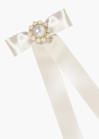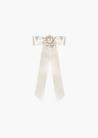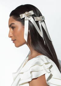 The Paityn Bow Barrette weds our classic bow with a signature pearl adornment. The smooth silk ribbon is punctuated with a sweet pearl cluster, complete with an antique-inspired halo. The automatic French barrette closure makes for easy placement in any hairstyle, and any type of hair. Material The Paityn Bow Barrette is made by hand in New York of silk ribbon, a crystal pearl center, and finished with a steel French barrette closure. We recommend treating this bow as you would a piece of jewelry, and storing in the dust bag when not in use. Avoid contact with water, perfume, and other chemicals, including hairspray, which should be used before placement in the hair.