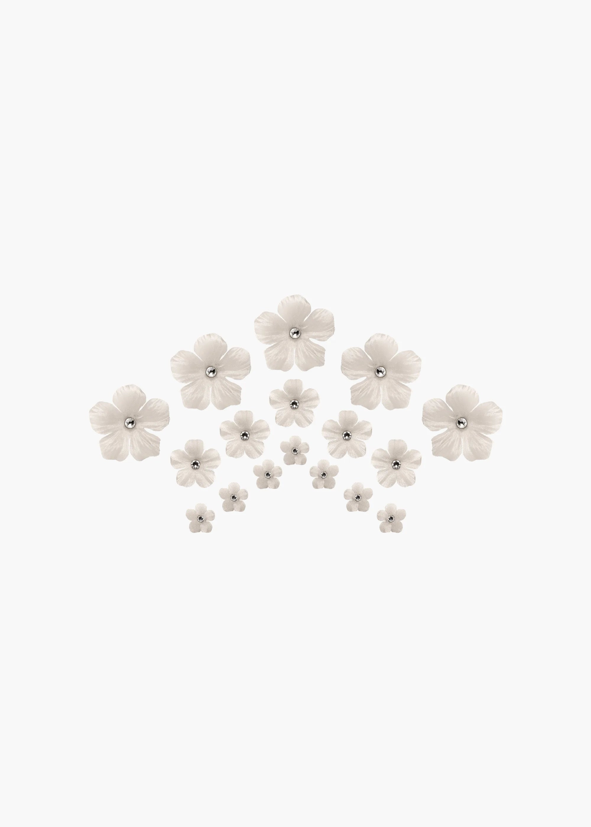 With their unique magnet closure, the Anemone Hair Magnets make it possible to achieve the look of flowers floating in the hair, even scattered up and down loose locks in a seemingly impossible arrangement. This set of 17 is made by hand in New York, with silk satin-faced organza flowers set in the center with Austrian crystals, or crystal pearls. We love these flowers layered with the Kira Hair Magnet Set or the Paige Hair Magnet Set. Dimensions: Small Flower - 5/8in Medium Flower - 1in Large Flower - 1 1/2in Material The Anemone Hair Magnet Set are a set of 17 hair magnets with 3 different sizes, handmade in New York of silk satin faced organza flowers and Austrian crystals or crystal pearls on durable silver toned magnetic hair clips They are designed to stay firmly in place, once other pins have the hairstyle securely fastened. We recommend treating each magnet as you would a piece of jewelry, and storing in the dust bag when not in use. Ensure to keep each magnet jewel set separate to avoid all magnets sticking together. Avoid contact with water, perfume, and other chemicals, including hairspray, which should be used before placement in the hair.