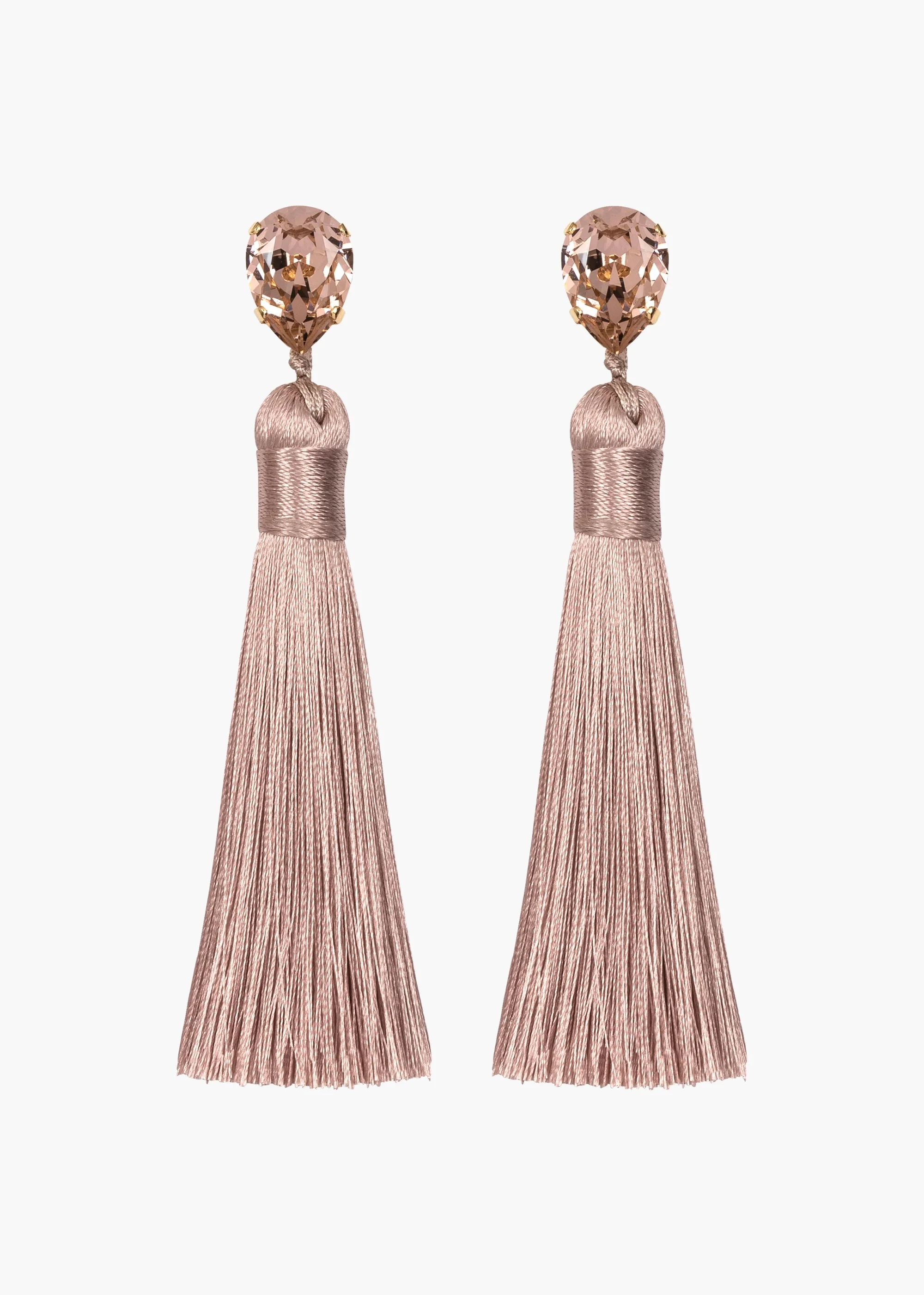 The Francine Earrings reference Art Deco interiors, with lush tassels and rich crystal accents for supreme drama. Made by hand in New York, satin tassels are suspended from pear-cut Austrian crystals. Despite their shoulder-grazing length and noteworthy movement, these earrings are exceptionally lightweight and comfortable to wear. Dimensions: 4.25" length Material The Francine Earrings are made by hand in New York from Austrian crystals, hand-made silk tassel dangles, and 18k gold plated brass. They have a surgical-steel post, are nickel-free and safe for sensitive skin. We recommend storing earrings in their dust bag while not in use, and avoiding contact with water, perfume, hairspray, and other chemicals.