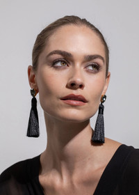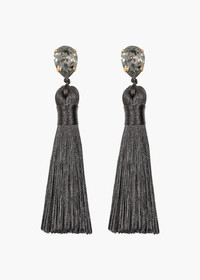 The Francine Earrings reference Art Deco interiors, with lush tassels and rich crystal accents for supreme drama. Made by hand in New York, satin tassels are suspended from pear-cut Austrian crystals. Despite their shoulder-grazing length and noteworthy movement, these earrings are exceptionally lightweight and comfortable to wear. Dimensions: 4.25" length Material The Francine Earrings are made by hand in New York from Austrian crystals, hand-made silk tassel dangles, and 18k gold plated brass. They have a surgical-steel post, are nickel-free and safe for sensitive skin. We recommend storing earrings in their dust bag while not in use, and avoiding contact with water, perfume, hairspray, and other chemicals.