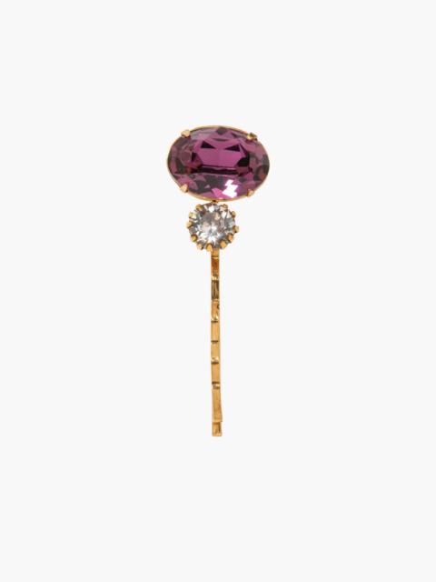 The Gemma Bobby Pin is inspired by the rich opulence of Renaissance art, unabashedly embracing jewel tones. Made of varying combinations of colorful Swarovski crystals and smaller complimentary stones, these gems are pure candy-colored fun. The Gemma Bobby Pin can be worn solo for a more subdued look, but we love creating drama with multiple colors stacked on, and mixing with the Perla Bobby Pins for a look fit for royalty. Dimensions: 2.25 x 0.75 x 0.5 inches Weight: 6g Material The Gemma Bobby Pin is made in New York of Swarovski crystal on a durable steel bobby pin, designed to stay firmly in place, once other pins have the hairstyle securely fastened. We recommend treating each pin as you would a piece of jewelry, and storing in the dust bag when not in use. Avoid contact with water, perfume, and other chemicals, including hairspray, which should be used before placement in the hair.