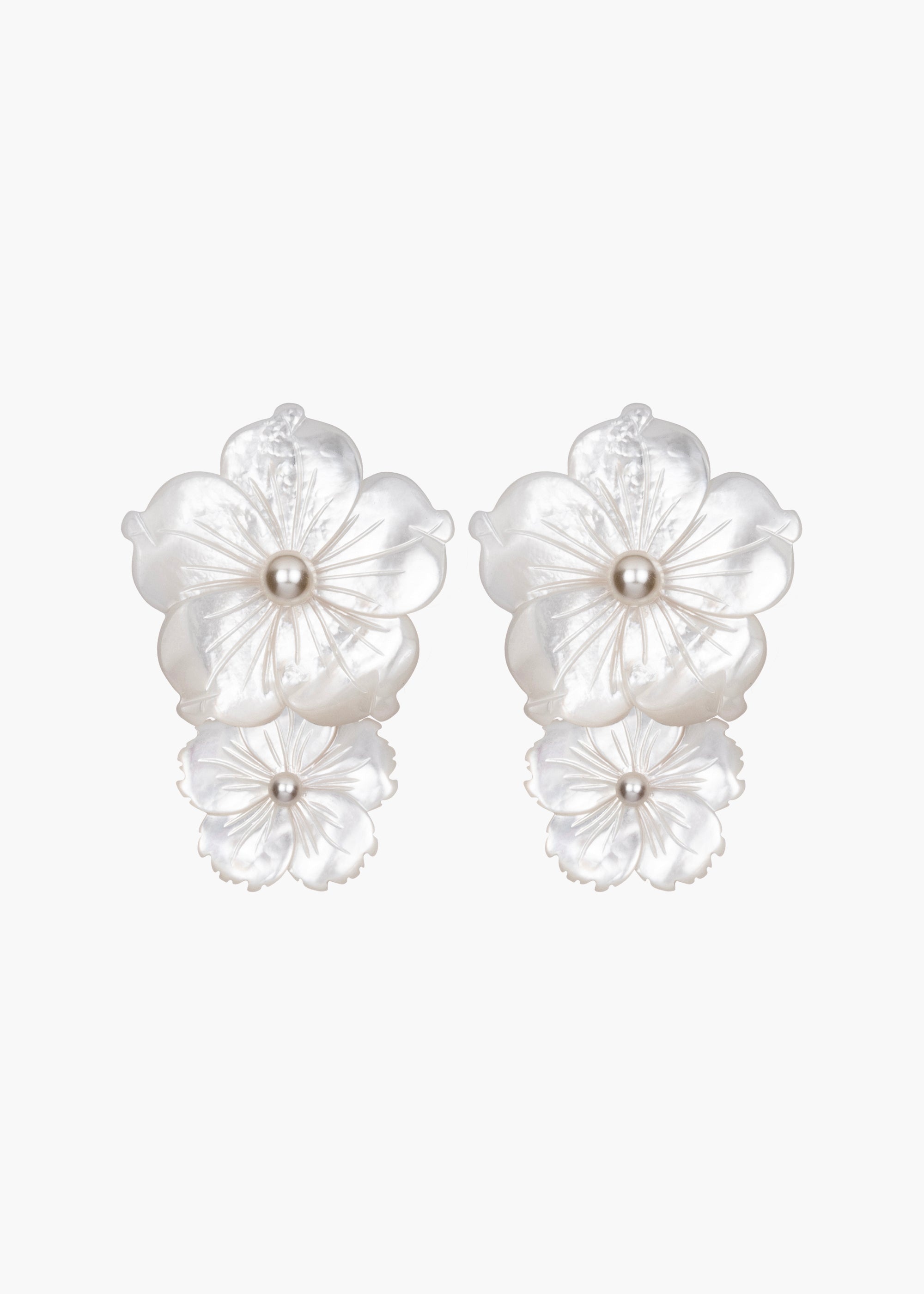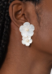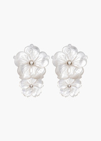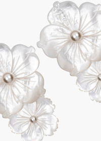 The Geneva Earrings find our iconic Colette Earrings reimagined in mother of pearl, one of our favorite materials for its incomparable iridescence. Each flower is carved by hand and set in the center with a pearl, with a hand-crafted setting that involves individually setting each flower by hand on wire, a labor-intensive process that results in an elevated finished look. These earrings are designed to mix with our mother of pearl hair accessories. Dimensions: 1.75" length. Material The Geneva Earrings are made by hand in New York from 18K gold plated brass and mother of pearl flowers. They have a surgical-steel post, are nickel-free, and safe for sensitive skin. We recommend storing earrings in their dust bag while not in use, and avoiding contact with water, perfume, hairspray, and other chemicals.