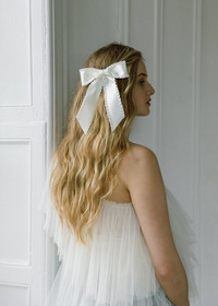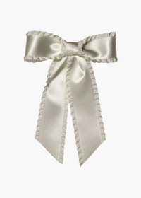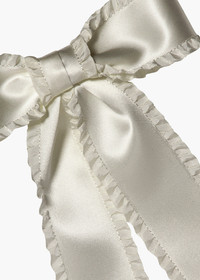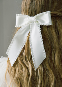 A true embodiment of our love for all-things-ruffled, the Harper Bow Barrette lends a touch of easy femininity to any look. This silk satin bow is adorned with ruffled edges, adding an unexpected textural element. Each bow is expertly sewn by hand in our Brooklyn studio, and features an automatic barrette closure, making it easy to style a multitude of ways. Material The Harper Bow Barrette is made by hand in New York of silk satin ribbon with a steel French barrette closure. We recommend treating this bow as you would a piece of jewelry, and storing in the dust bag when not in use. Avoid contact with water, perfume, and other chemicals, including hairspray, which should be used before placement in the hair.