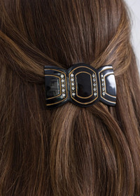 A vintage piece sourced in France, the Hattie Vintage French Barrette was crafted by hand between the 1920s and 1950s— an era during which France was especially famous for hair accessory production. Referencing 1930s design, the cellulose acetate barrette is set with Austrian crystals and traced with gold lines that emphasize the Art Deco silhouette. It's finished with an automatic French barrette clasp for easy and secure placement in any hairstyle. Material The Hattie Vintage French Barrette is made by hand in France from inset Austrian crystal and vintage cellulose acetate, with a French barrette closure. We recommend treating this clip as you would a piece of jewelry, and storing in the dust bag when not in use. Avoid contact with water, perfume, and other chemicals, including hairspray, which should be used before placement in the hair.