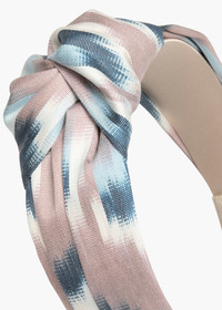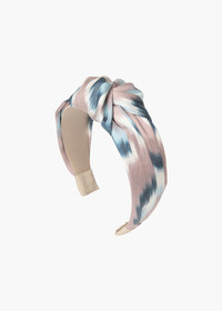 The Ikat Samaya Headband is crafted by hand of gorgeous ikat fabric, woven by hand in Turkey. Featuring the iconic Jennifer Behr knotted shape, it's crafted by hand in our New York studio, masterfully draped by hand to achieve the perfect flattering shape. The variations inherent to the ikat fabric result in subtle distinctions in color placement, making each one entirely one-of-a-kind. Dimensions: 2.25 inches wide, 0.5 inches padding Material The Ikat Samaya Headband is made in New York of hand-draped Turkish ikat on a silk satin covered base, and lined in grosgrain ribbon to ensure ultimate comfort and promote hair health. We recommend treating this headband as you would a piece of jewelry, and storing it in the dust bag when not in use. Avoid contact with water, perfume, and other chemicals, including hairspray, which should be used before placement in the hair.