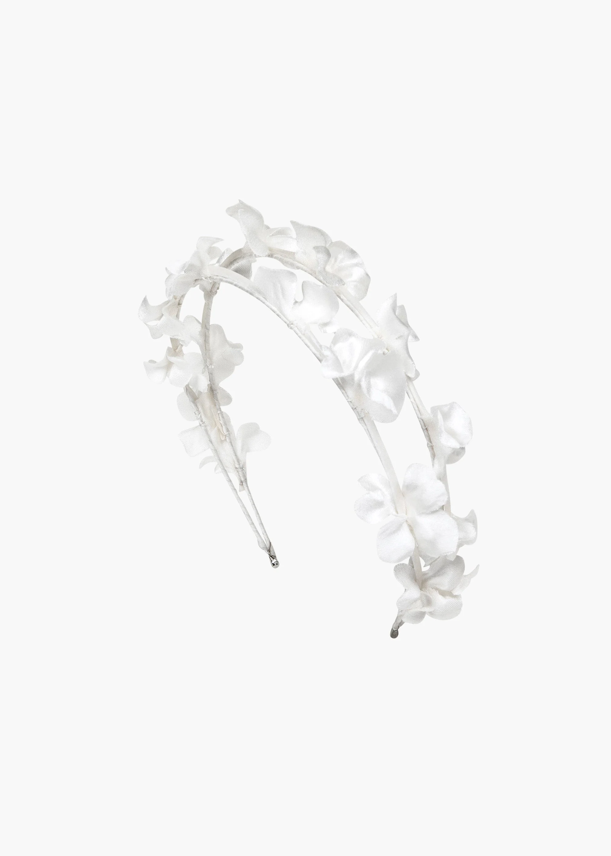 Providing the effect of a vine of flowers woven in the hair, the Isabella Headband is an ethereal finishing touch. Made by hand in New York, the satin-faced organza flowers have a lifelike presence, complete with sculptural details one would find in nature. The twin strands sit on a ribbon-wrapped headband base, for easy placement in the hair. Material The Isabella Headband is crafted by hand in New York from satin-faced organza flowers set on a silk ribbon-wrapped headband base to ensure ultimate comfort and promote hair health. We recommend storing headbands in their dust bag while not in use. Avoid contact with water, perfume, and other chemicals, including hairspray, which should be used only before placement in the hair.