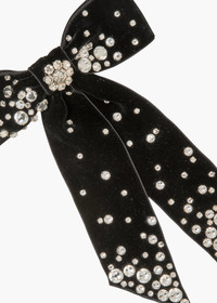 The Isabelle Bow Barrette combines splashes of oversized crystals with smaller stones in an arrangement that suggests windswept flakes descending into drifts of snow. Made by hand in New York, each fine crystal is hand-embroidered on the silk velvet bow. It's finished with an automatic French barrette closure, for secure, effortless placement in the hair. Material The Isabelle Bow Barrette is made by hand in New York from hand-embroidered gem-cut Czech crystals on a silk velvet bow, and finished with a steel French barrette closure. We recommend treating this bow as you would a piece of jewelry, and storing in the dust bag when not in use. Avoid contact with water, perfume, and other chemicals, including hairspray, which should be used before placement in the hair.