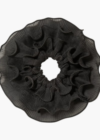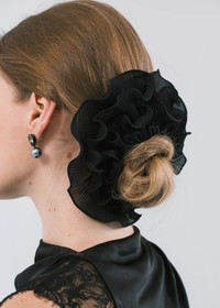 The Jacinda Ponywrap is a finishing touch as romantic as it is easy to wear. Made by hand in our Brooklyn studio, the pleated organza is hand-gathered into ruffles, which hold their structure for consistent volume. The interior is elastic, making it secure in any style, whether worn over a ponytail or chignon. Dimensions: 8in x 8in + 5in inner Material The Jacinda Ponywrap is made in New York from hand-gathered organza ruffles and finished with a high quality elastic chord. We recommend treating this piece as you would a piece of jewelry, and storing in the dust bag when not in use. Avoid contact with water, perfume, and other chemicals, including hairspray, which should be used before placement in the hair.