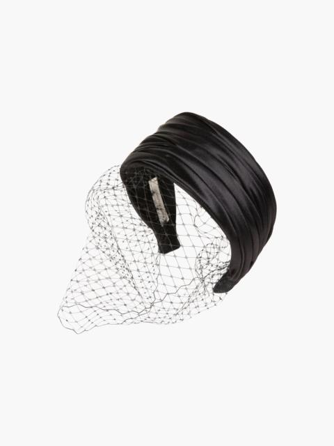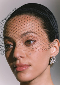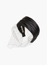 The Jacqueline Voilette Headband is an unforgettable look, with a design informed by classic vintage millinery and 1960s pillbox hats. Its base is handcrafted in Italy, then hand-draped with silk satin in our New York studio, and finished with our iconic veiling. The top of the headband is tilted forward, so that the back stands above the head rather than lying flush, creating dramatic height. Material The Jacqueline Voilette Headband is made in New York from nylon netting on a hand-draped silk satin wrapped wide headband. We recommend storing headbands in their dust bag while not in use. Avoid contact with water, perfume, and other chemicals, including hairspray, which should be used only before placement in the hair.