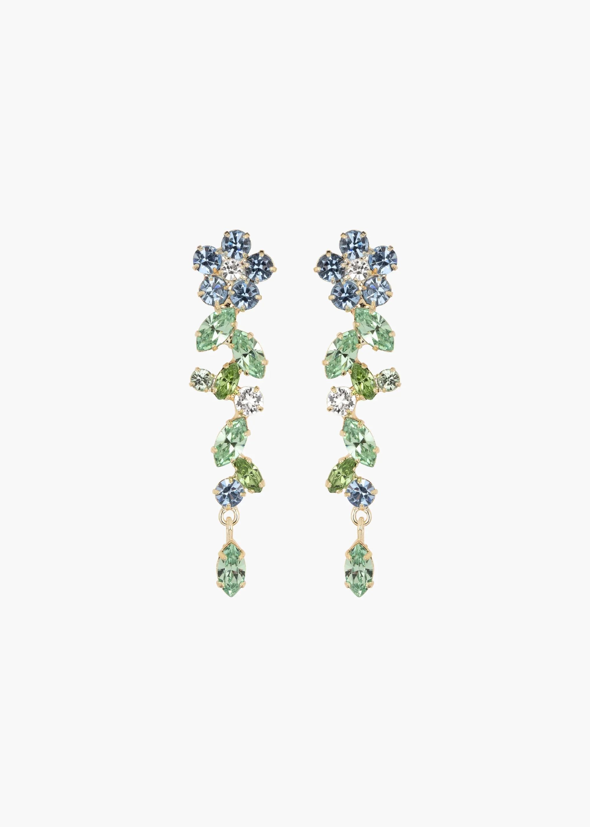 Inspired by bountiful English gardens, the Jasmina Earrings are linear drops with a flattering elongating effect. Made by hand in New York, Austrian crystals in round and marquise cuts form a lush floral garland, in an 18-karat gold or rhodium-plated setting. The bottommost leaf is fixed on a ring to tremble freely, like a vine in the breeze. Material The Jasmina Earrings are made by hand in New York from 18K gold plated brass and Austrian crystals. They have a surgical-steel post, are nickel-free, and safe for sensitive skin. We recommend storing earrings in their dust bag while not in use, and avoiding contact with water, perfume, hairspray, and other chemicals.