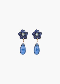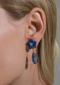 Using semi-precious gemstones and fine jewelry techniques, the Jaylene Earrings are a future heirloom that you'll reach for regularly. Made by hand in New York, the richly detailed flowers are hand-carved from lapis lazuli, a gemstone so highly prized through history that in the Middle Ages, it was more valuable than gold, reserved for important masterpieces, symbolizing divinity and wealth. The blue quartz drop sways freely, emphasizing its incredible hue, while the Austrian crystal accents play off the gemstones' luster for added sparkle. Material The Jaylene Earrings are made by hand in New York from hand-carved semi-precious lapis lazuli flowers, blue quartz drops, Austrian crystals, and 18K gold plated brass. All stones have natural variances in color and markings that make each one unique. They have a surgical-steel post, are nickel-free and safe for sensitive skin. We recommend storing earrings in their dust bag while not in use, and avoiding contact with water, perfume, hairspray, and other chemicals.