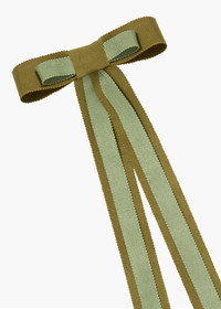 The Eden Bow Barrette was designed in collaboration with Julia Berolzheimer and features a bi-color sage and moss bow with long tails that flow through the hair for easy summer styling. The greens of this bow can pair with graphic patterns, floral prints, or a crisp white shirt. This bow is crafted by hand in New York from classic grosgrain ribbon, and mounted on a convenient and versatile automatic French barrette closure. Dimensions: 4.25" width, 10" length Material The Jennifer Behr x Julia Berolzheimer Eden Bow Barrette is made by hand in New York of grosgrain ribbon with a steel French barrette closure. We recommend treating this bow as you would a piece of jewelry, and storing in the dust bag when not in use. Avoid contact with water, perfume, and other chemicals, including hairspray, which should be used before placement in the hair.