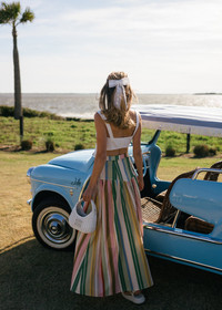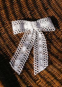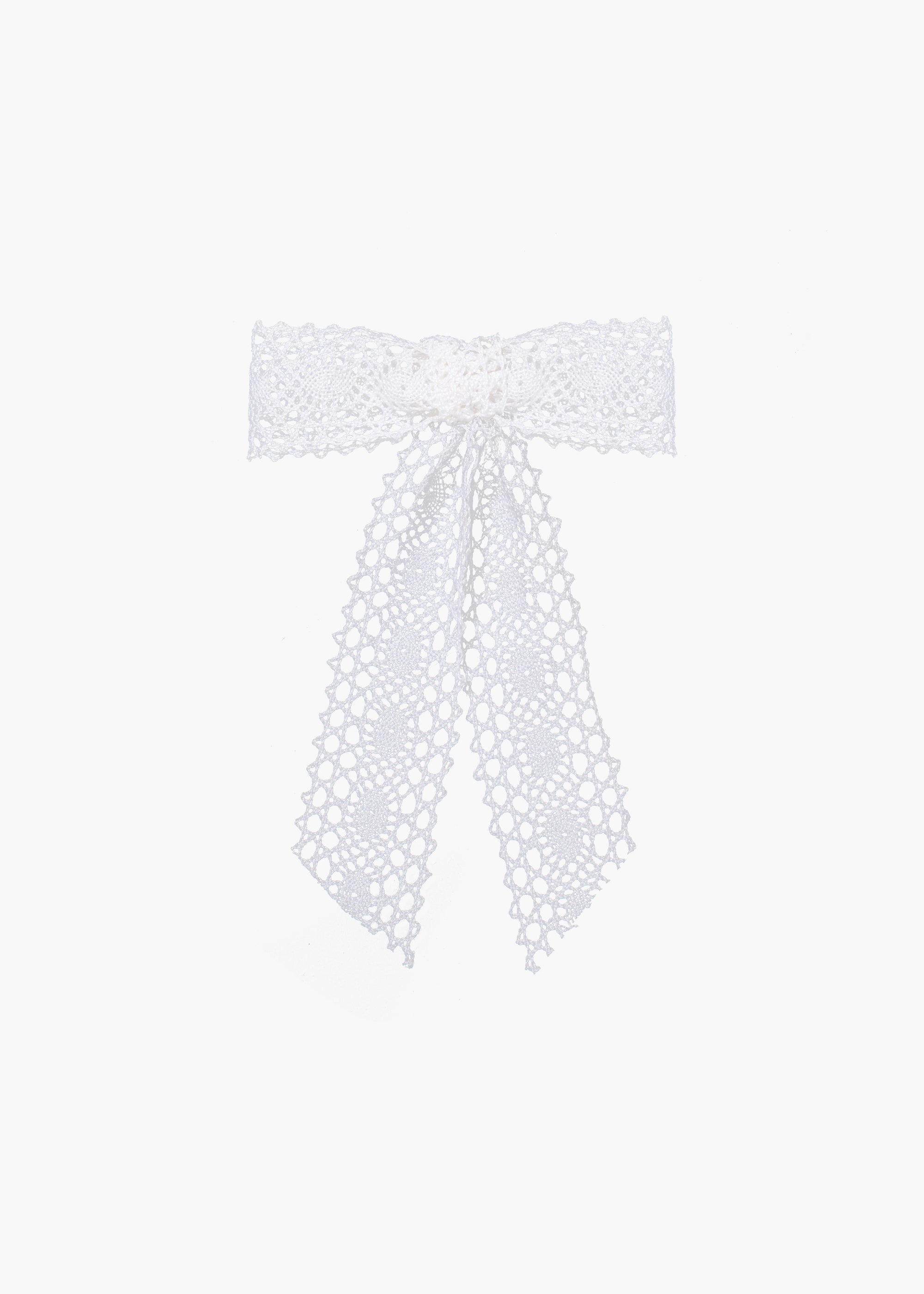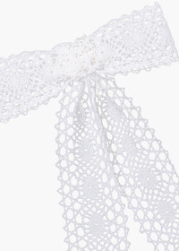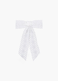 A unique addition to our beloved bow collection, the Marbella Bow Barrette was designed in collaboration with Julia Berolzheimer, who was inspired to create a piece that she would be excited to slip into her hair on glorious summer days. This bow is crafted by hand in New York of vintage crochet ribbon from the 1960s. It's finished with an automatic French barrette clasp, making it versatile enough to style a number of ways. Dimensions: 6" width, 8.5" length Material The Jennifer Behr x Julia Berolzheimer Marbella Bow Barrette is made by hand in New York of vintage crochet lace ribbon with a steel French barrette closure. We recommend treating this bow as you would a piece of jewelry, and storing in the dust bag when not in use. Avoid contact with water, perfume, and other chemicals, including hairspray, which should be used before placement in the hair.