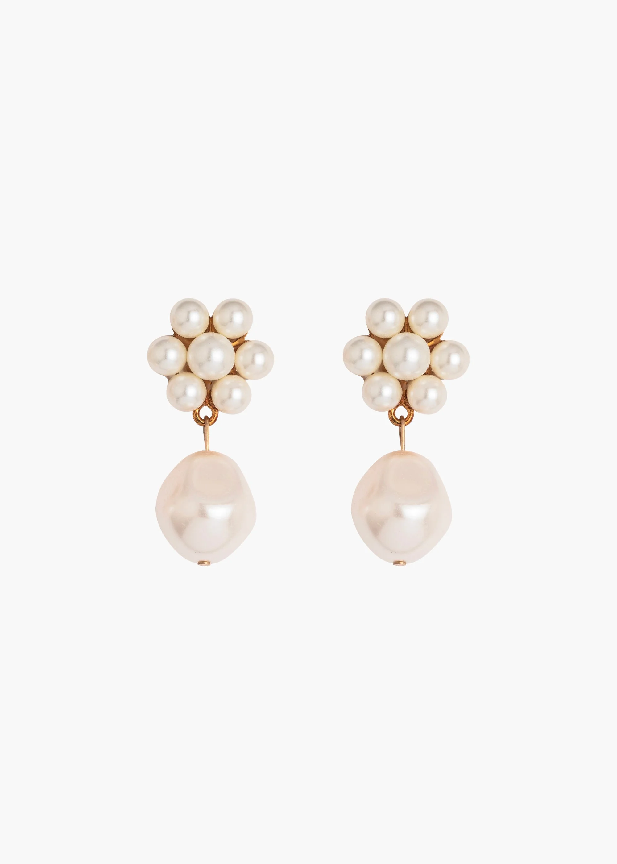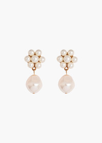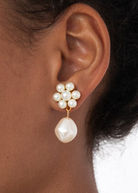 The Josie Earrings put a playful spin on the classic pearl drop. Each stud features five petite pearls clustered into a sweet floral shape, with a trailing baroque pearl drop. The irregular shape of the baroque pearl adds an organic sophistication, balancing the sweetness of the delicate floral design. Try pairing this style with the Belladonna Headband for a coordinated pearl look. Material The Josie Earring is a post earring with a surgical-steel post. Our earrings are nickel-free and safe for sensitive skin. These earrings are made by hand in New York, from 18K gold plated brass and set with hand glued Czech glass pearls and poly baroque pearl drops. We recommend storing earrings in their dust bag while not in use, and avoiding contact with water, perfume, hairspray, and other chemicals.