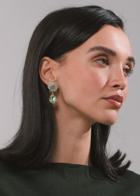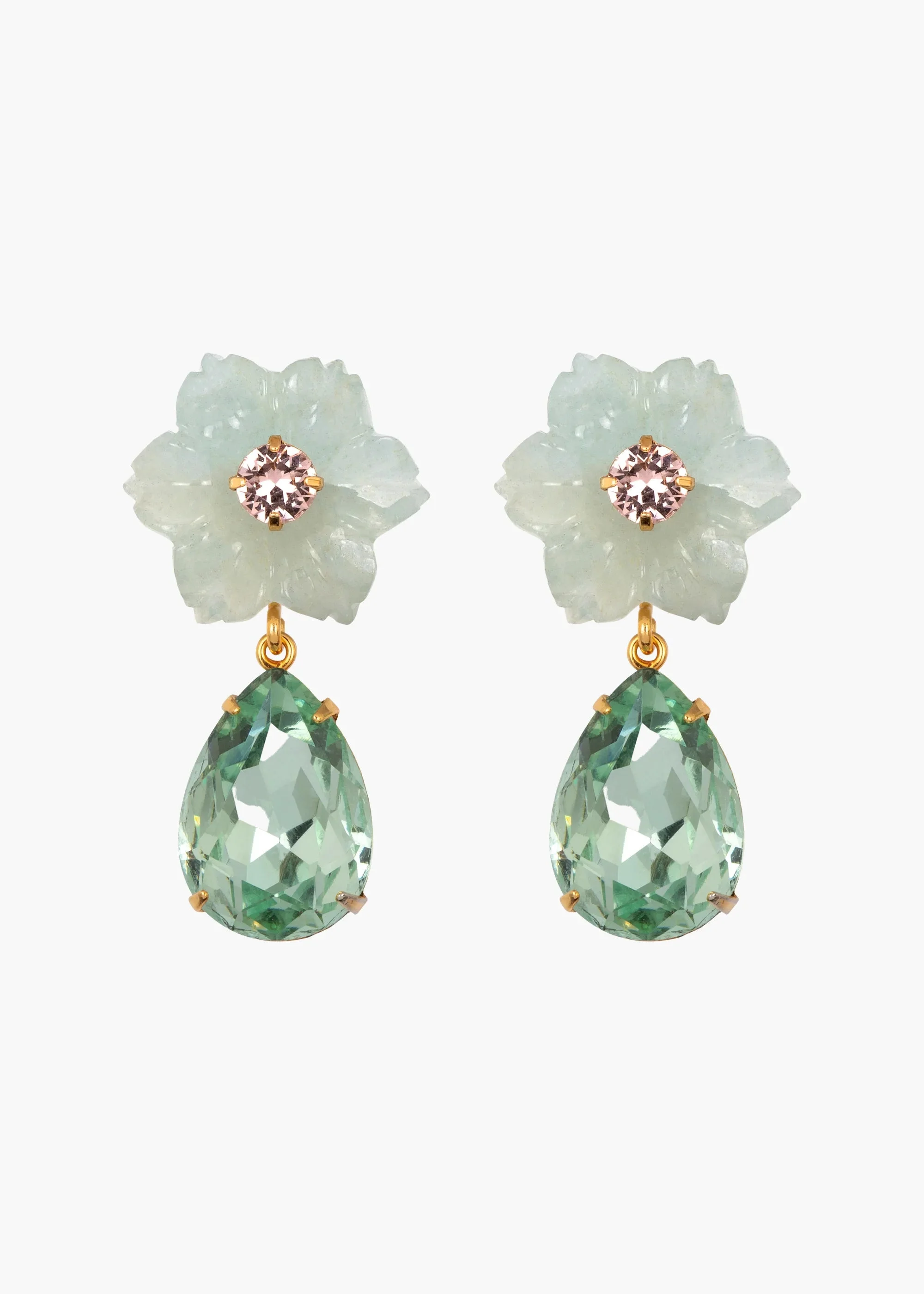 Playfully layering semi-precious gemstones with Austrian crystals, the Juna Earrings are romantic drops, featuring aquamarine, lemon quartz, or blue chalcedony. Made by hand in New York with an 18-karat gold-plated setting, the hand-carved detail on each flower highlights the unique inherent beauty of the organic material— due to natural variations, each pair is one-of-a-kind. The sparkling crystals stand in contrast to the semi-precious stones' ethereal translucence, the mix of transparency and opacity creating rich dimension. Dimensions: 1 5/8in x 3/4in Material The Juna Earrings are made by hand in New York from 18K gold plated brass and a hand-carved semi-precious stone flower with Austrian crystal drops and accents. All stones have natural variances in color and markings that make each one unique. They have a surgical-steel post, are nickel-free, and safe for sensitive skin. We recommend storing earrings in their dust bag while not in use, and avoiding contact with water, perfume, hairspray, and other chemicals.