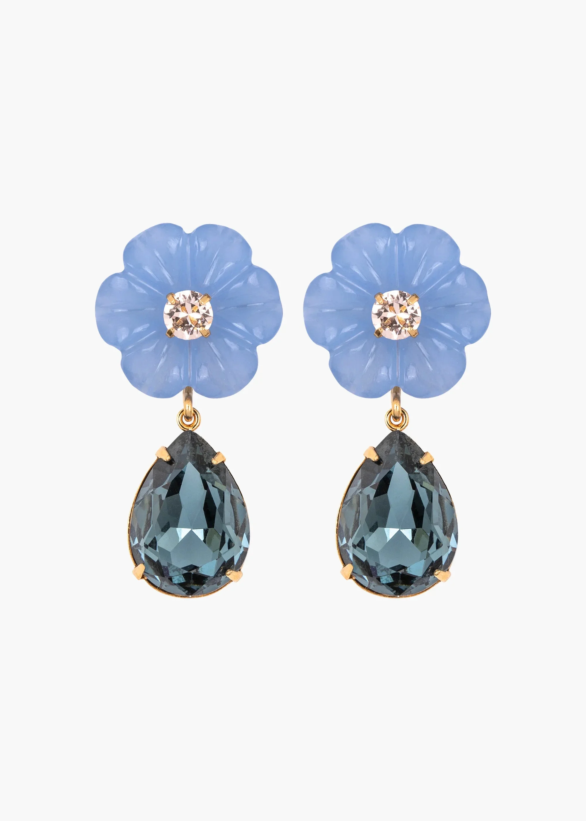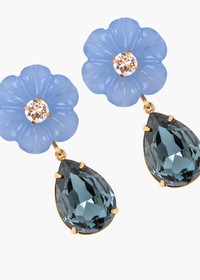 Playfully layering semi-precious gemstones with Austrian crystals, the Juna Earrings are romantic drops, featuring aquamarine, lemon quartz, or blue chalcedony. Made by hand in New York with an 18-karat gold-plated setting, the hand-carved detail on each flower highlights the unique inherent beauty of the organic material— due to natural variations, each pair is one-of-a-kind. The sparkling crystals stand in contrast to the semi-precious stones' ethereal translucence, the mix of transparency and opacity creating rich dimension. Dimensions: 1 5/8in x 3/4in Material The Juna Earrings are made by hand in New York from 18K gold plated brass and a hand-carved semi-precious stone flower with Austrian crystal drops and accents. All stones have natural variances in color and markings that make each one unique. They have a surgical-steel post, are nickel-free, and safe for sensitive skin. We recommend storing earrings in their dust bag while not in use, and avoiding contact with water, perfume, hairspray, and other chemicals.