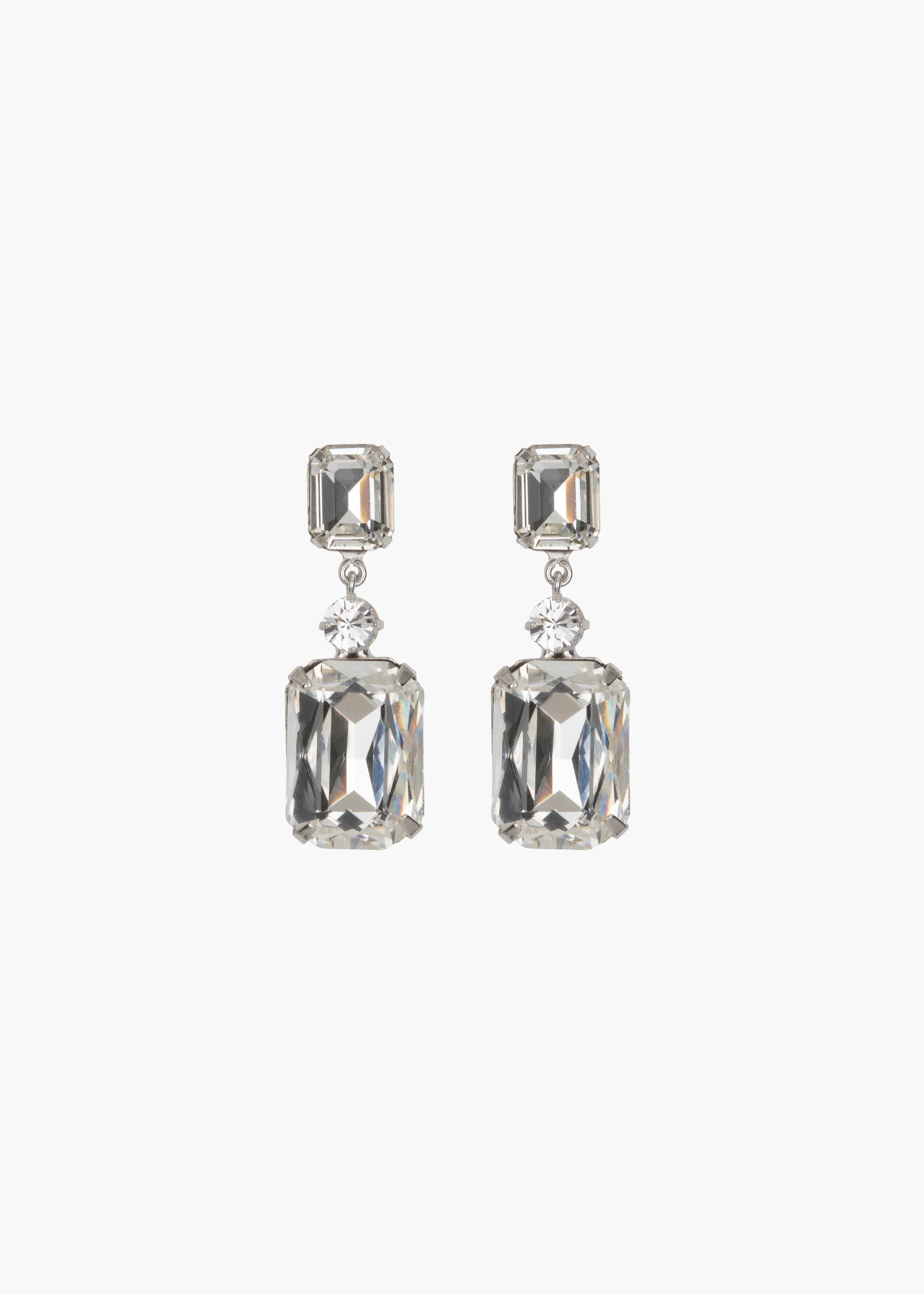 Your Bejeweled Era begins with the Justine Earrings. A pair of stately emerald-cut crystals in complementary hues are separated by a single delicate round stone. These superior drops will remain in constant rotation in your wardrobe for years to come. Material The Justine Earrings are made by hand in New York from 18K gold or rhodium plated brass and crystal. They have a surgical-steel post, are nickel-free, and safe for sensitive skin. We recommend storing earrings in their dust bag while not in use, and avoiding contact with water, perfume, hairspray, and other chemicals.