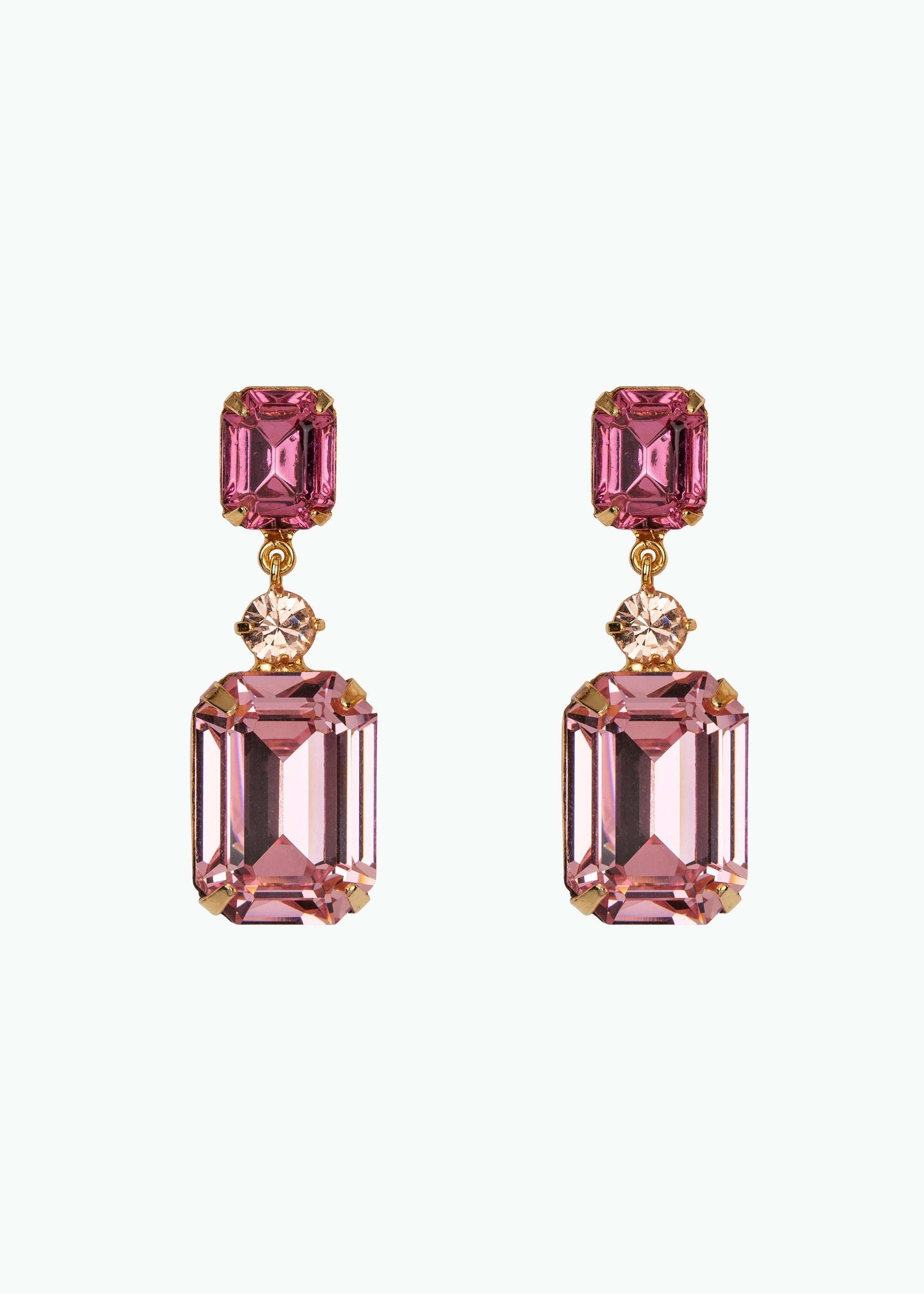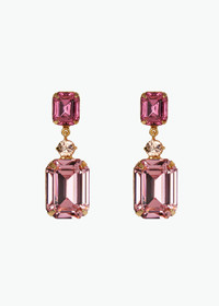 Your Bejeweled Era begins with the Justine Earrings. A pair of stately emerald-cut crystals in complementary hues are separated by a single delicate round stone. These superior drops will remain in constant rotation in your wardrobe for years to come. Material The Justine Earrings are made by hand in New York from 18K gold or rhodium plated brass and crystal. They have a surgical-steel post, are nickel-free, and safe for sensitive skin. We recommend storing earrings in their dust bag while not in use, and avoiding contact with water, perfume, hairspray, and other chemicals.