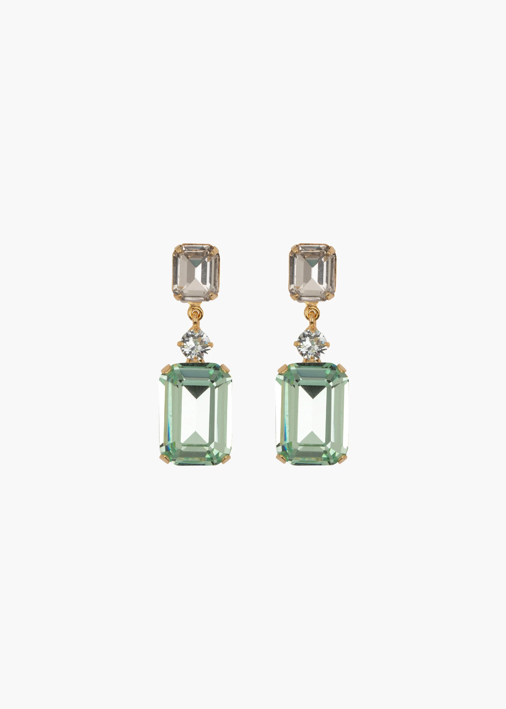 Your Bejeweled Era begins with the Justine Earrings. A pair of stately emerald-cut crystals in complementary hues are separated by a single delicate round stone. These superior drops will remain in constant rotation in your wardrobe for years to come. Dimensions: 1.5" length. Material The Justine Earrings are made by hand in New York from 18K gold or rhodium plated brass and crystal. They have a surgical-steel post, are nickel-free, and safe for sensitive skin. We recommend storing earrings in their dust bag while not in use, and avoiding contact with water, perfume, hairspray, and other chemicals.