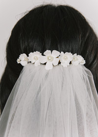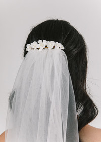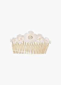 The Karissa Comb is defined by its realistic pearl-set flowers, made by hand of polymer clay, to create the look of porcelain. Worn atop a veil, this comb flawlessly finishes the look of a veil; add the matching Karissa Bobby Pin Set for an ethereal look once the veil is removed. This comb can be worn many ways: wrapped around a chignon, slipped in a French twist, or tucked in the side of the hair for a side-swept look. Dimensions: 1.75” in height, 8.75” in length. Material The Karissa Comb is assembled by hand in New York of Ukrainian hand pressed polymer flowers with Czech crystal pearl centers, on a 18k plated brass comb, which is designed to stay firmly in place, once other pins have the hairstyle securely fastened. We recommend treating this comb as you would a piece of jewelry, and storing in the dust bag when not in use. Avoid contact with water, perfume, and other chemicals, including hairspray, which should be used before placement in the hair. Shipping