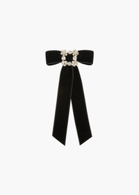 The Kinley Bow Barrette is a Baroque twist on our bestselling bow. Our classic velvet bow is framed by an ornate buckle of fine crystals in a floral motif. It's finished with an automatic French barrette closure, making placement in the hair a breeze. Dimensions: 5 inch width, 6.5 inch length Material The Kinley Bow Barrette is made by hand in New York of silk velvet ribbon, embellished with Austrian crystals, and finished with a steel French barrette closure. We recommend treating this bow as you would a piece of jewelry, and storing in the dust bag when not in use. Avoid contact with water, perfume, and other chemicals, including hairspray, which should be used before placement in the hair.