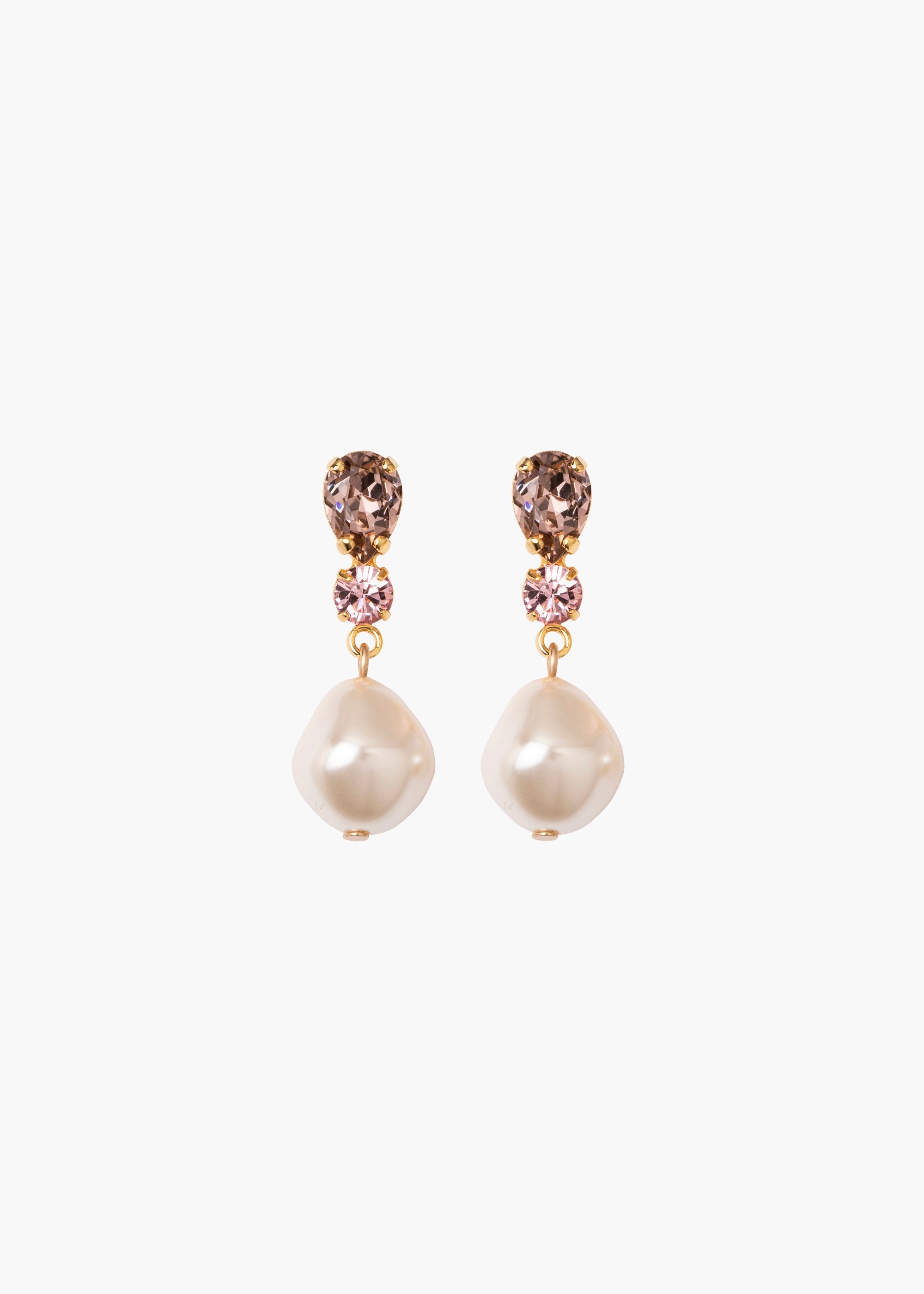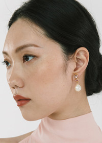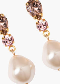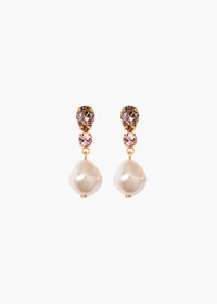 The Kristina Earrings are a modern drop earring seeped in classic style. A cluster of pear-shaped and round crystals forms a geometric motif. The baroque-style crystal pearls swing like glowing orbs, complementing the crystals' twinkle. Dimensions: 1.375" length. Material The Kristina Earrings are made by hand in New York from 18K gold or rhodium plated brass and crystal with a poly baroque drop pearl. They have a surgical-steel post, are nickel-free, and safe for sensitive skin. We recommend storing earrings in their dust bag while not in use, and avoiding contact with water, perfume, hairspray, and other chemicals.