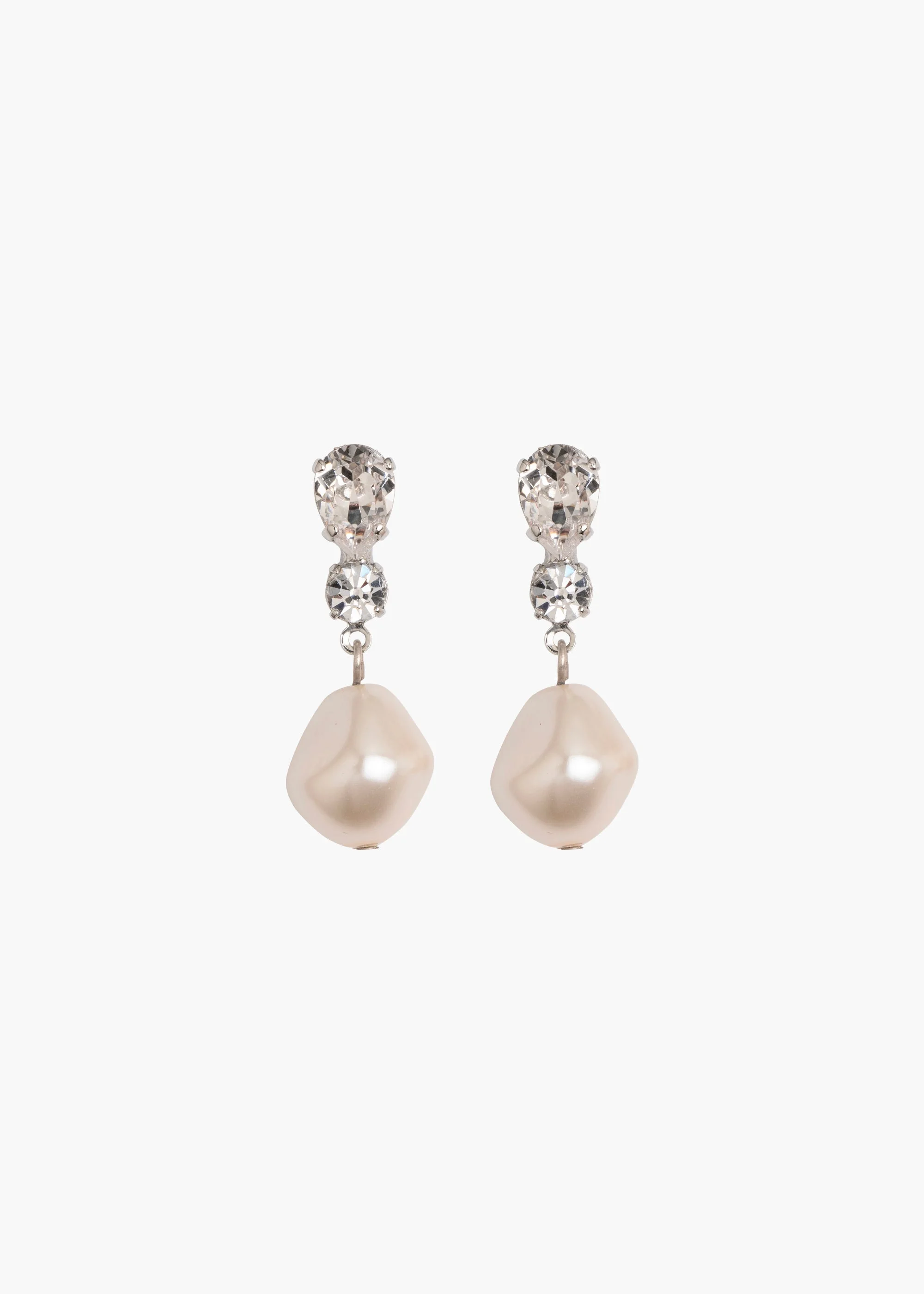 The Kristina Earrings are a modern drop earring seeped in classic style. A cluster of pear-shaped and round crystals forms a geometric motif. The baroque-style crystal pearls swing like glowing orbs, complementing the crystals' twinkle. Dimensions: 1.375" length. Material The Kristina Earrings are made by hand in New York from 18K gold or rhodium plated brass and crystal with a poly baroque drop pearl. They have a surgical-steel post, are nickel-free, and safe for sensitive skin. We recommend storing earrings in their dust bag while not in use, and avoiding contact with water, perfume, hairspray, and other chemicals.