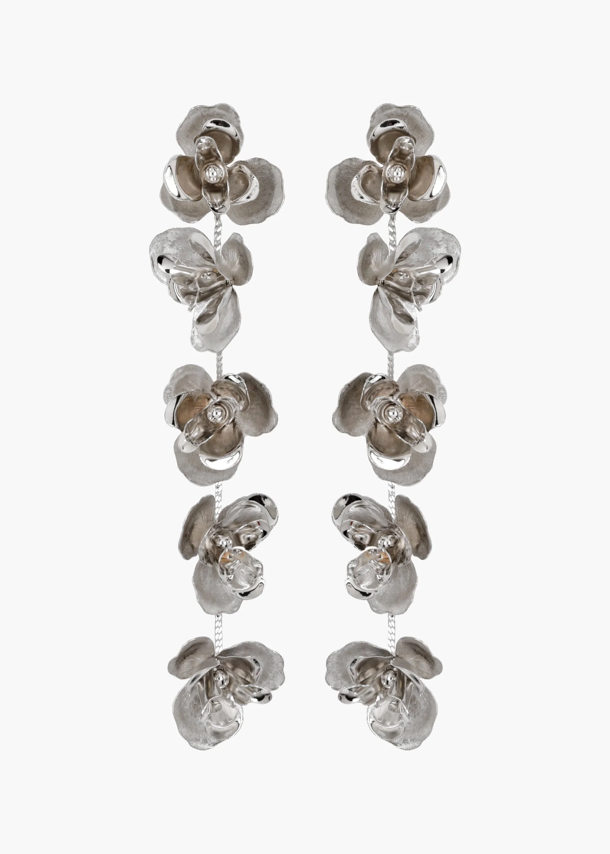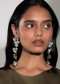 A clever geometric take on one of our beloved floral motifs, the Larena Earrings are a head-turning conversation piece. Inspired by Art Deco's Machine Age aesthetic, these flowers are formed by hand and plated with rhodium for a sleek look. Made by hand in New York, the movement of the drops emphasizes their intricate shape, but they are extremely lightweight on the ear despite their impressive scale. Material The Larena Earrings are made by hand in New York from hand-formed rhodium plated brass flowers. They have a surgical-steel post, are nickel-free, and safe for sensitive skin. We recommend storing earrings in their dust bag while not in use, and avoiding contact with water, perfume, hairspray, and other chemicals.