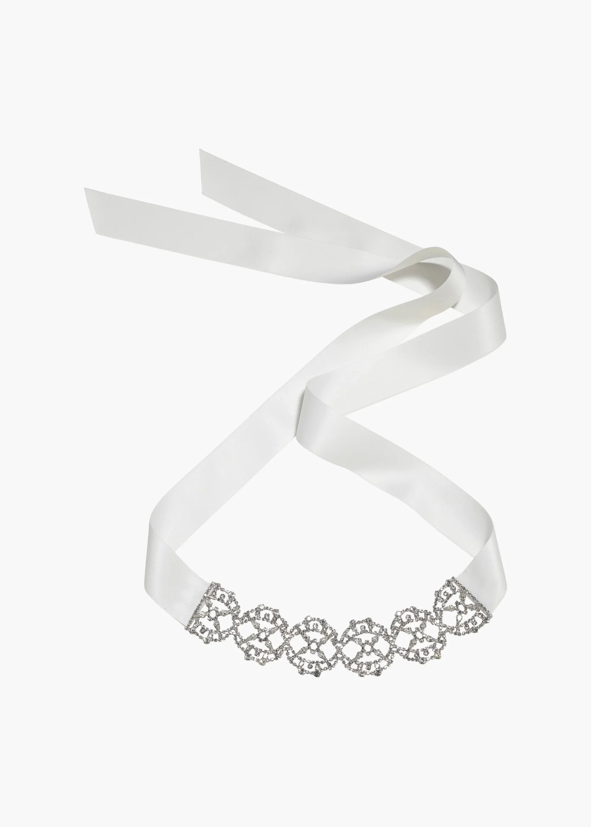 The Lavinia Ribbon Tie draws inspiration from the fabulously ornate collar chokers favored during the Belle Epoque. Like an alluring swath of mesh, the fine Austrian crystal adornment allows the skin to peek through. Made by hand in New York, it ties in the back with silk ribbon, ensuring a precise fit, whether worn as a choker or in the hair. Dimensions: 66 inch length Material The Lavinia Ribbon Tie is made by hand in New York of gunmetal-plated brass or rhodium-plated brass and Austrian crystals with a silk ribbon tie. We recommend treating this piece as you would a piece of jewelry, and storing in the dust bag when not in use. Avoid contact with water, perfume, and other chemicals, including hairspray, which should be used before placement in the hair or on the body.