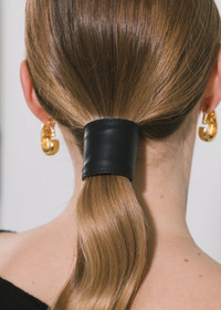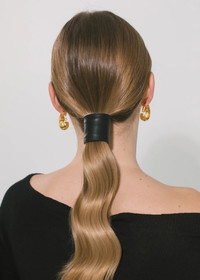 An enduring Jennifer Behr silhouette that dates to the brand's earliest days, the Leather Ponywrap creates an instantly polished look. Each one is made by hand in New York of supple lambskin leather, lined in suede with a bendable wire interior, making it possible to perfectly curve it around your ponytail, no matter its thickness— simply form your ponytail and secure with the elastic, then bend the leather around the hair. The Japanese elastic is specifically selected for its strength and stretch— layer multiples at once for a statement look. Dimensions: 1 3/4in x 5in Material The Leather Ponywrap is made by hand in New York of supple lambskin leather, lined in suede with a bendable wire interior. We recommend treating this piece as you would a piece of jewelry, and storing in the dust bag when not in use. Avoid contact with water, perfume, and other chemicals, including hairspray, which should be used before placement in the hair.