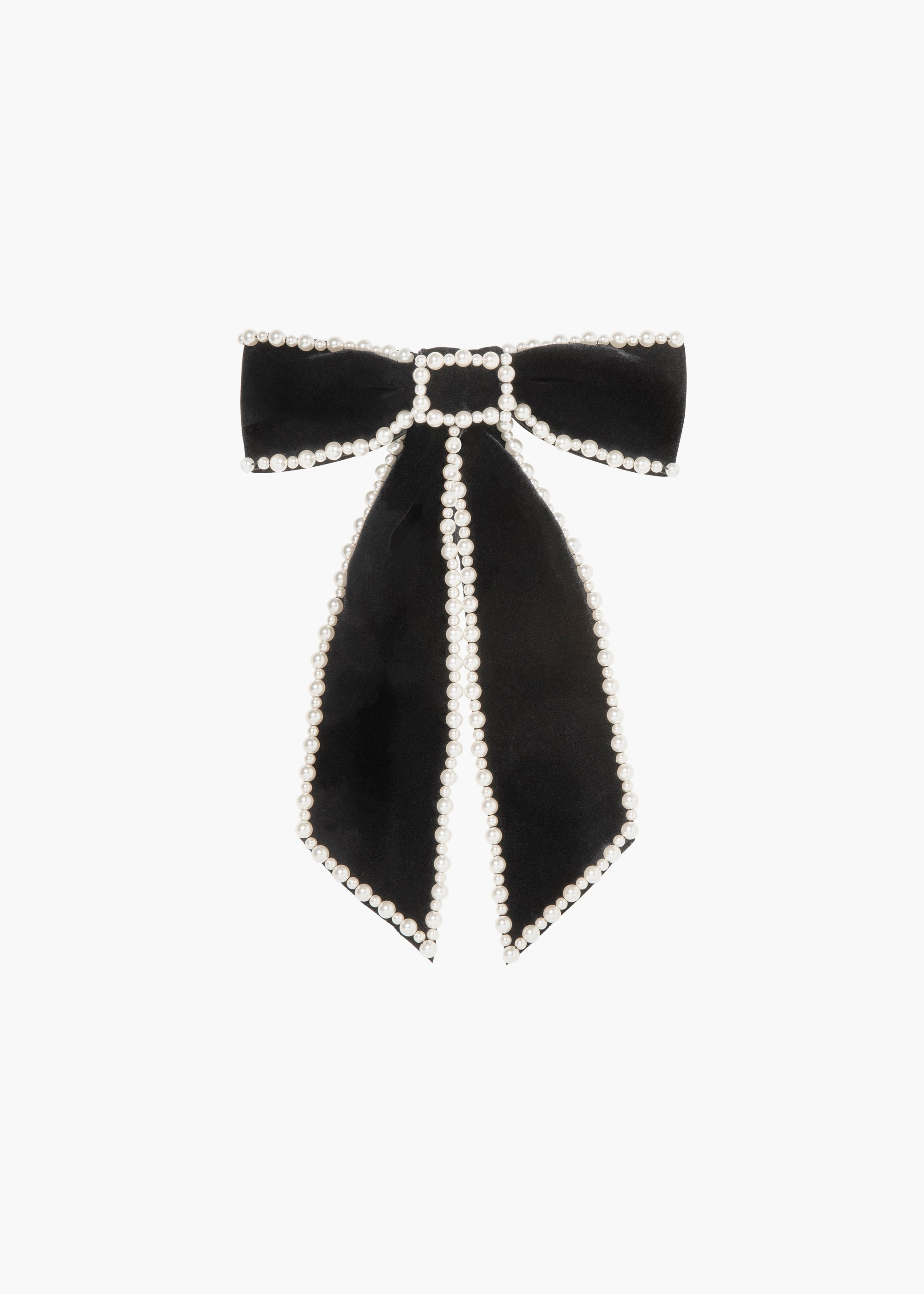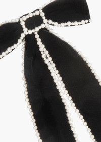 A pearlescent border transforms a simple velvet bow into a resplendent finishing touch—that’s the beauty of the Lenox Bow Barrette. The Czech crystal pearls are meticulously hand embroidered onto the ribbon in our New York studio, and it's all mounted on a French barrette closure that makes it easy to wear a multitude of ways: in the back of the hair, swept to the side, above a ponytail, and more. Material The Lennox Bow Barrette is made by hand in New York of rayon velvet ribbon embroidered with Czech crystal pearls, and finished with a steel French barrette closure. We recommend treating this bow as you would a piece of jewelry, and storing in the dust bag when not in use. Avoid contact with water, perfume, and other chemicals, including hairspray, which should be used before placement in the hair.