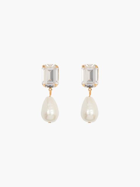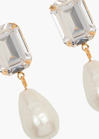 The Liana Earring is a classic pearl drop dialed up a notch. Crafted by hand in New York, baroque shaped pearls are set to dangle from dazzling emerald-cut Czech crystals—a winning combination of fine materials that carry dynamic movement. Material The Liana Earring is a post earring with a surgical-steel post. Our earrings are nickel-free and safe for sensitive skin. These earrings are made by hand in New York, from 18K gold plated brass set with fine Czech crystal and Kiska glass baroque pearl drops. We recommend storing earrings in their dust bag while not in use, and avoiding contact with water, perfume, hairspray, and other chemicals.