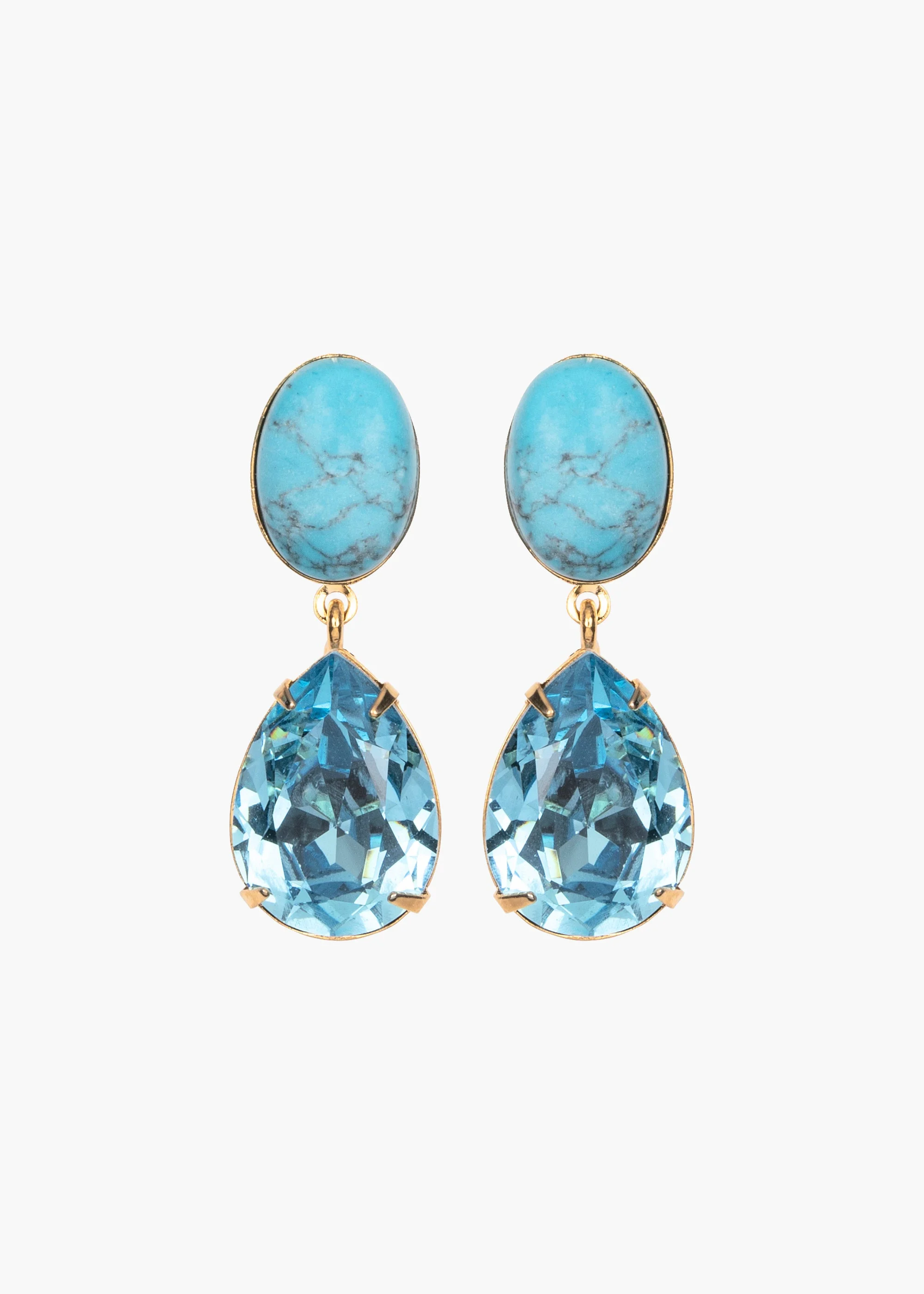 The Linette Earrings are inspired by the sparking surface and vivid blue of the Adriatic Sea, conjuring fond memories of bygone travels. Made by hand in New York, they feature genuine turquoise, which we adore for its natural variations. A pear-shaped crystal drop completes the look, adding movement that guarantees that oceanic sparkle. Dimensions: 1.5 inch length Material The Linette Earrings are made by hand in New York from semi-precious stone elements and Czech crystals. All stones have natural variances in color and markings that make each one unique. They have a surgical-steel post, are nickel-free and safe for sensitive skin. We recommend storing earrings in their dust bag while not in use, and avoiding contact with water, perfume, hairspray, and other chemicals.
