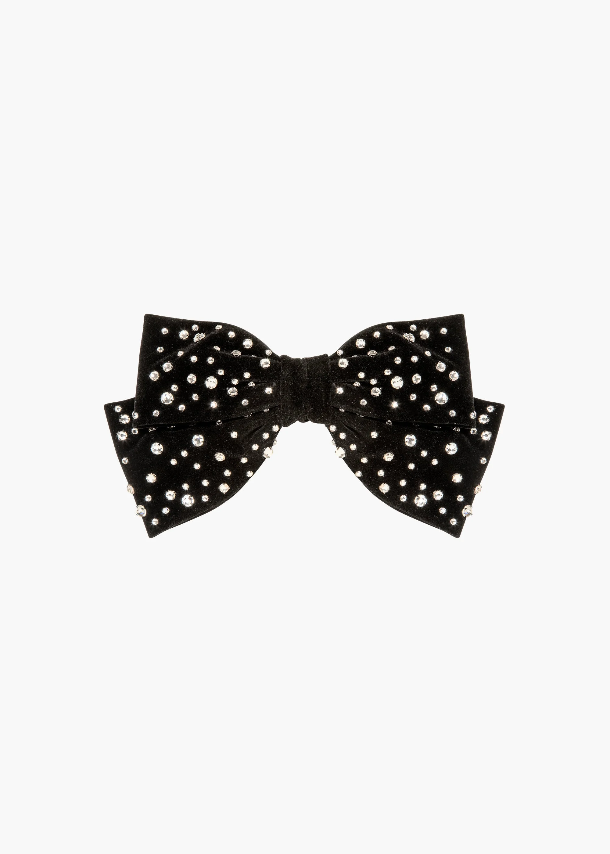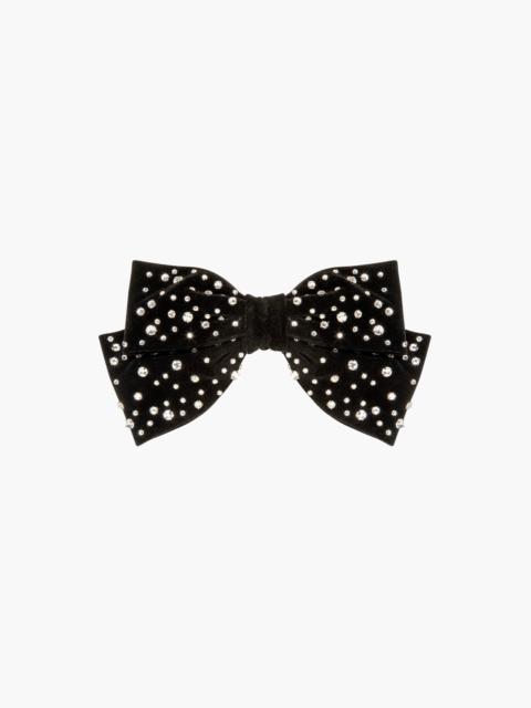 The Loren Bow Barrette features hand-embroidered crystals on an oversized silk velvet bow. This chic confection explodes with abounding shine like stars in the night sky. Made by hand in New York, it's finished with an automatic French barrette closure, for secure, effortless placement in the hair. Material The Loren Bow Barrette is made by hand from hand-embroidered gem-cut Czech crystals on a silk velvet bow, and finished with a steel French barrette closure. We recommend treating this bow as you would a piece of jewelry, and storing in the dust bag when not in use. Avoid contact with water, perfume, and other chemicals, including hairspray, which should be used before placement in the hair.