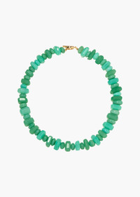 The Luana Necklace celebrates the beauty of natural semi-precious chrysoprase, known as the mood-booster of the gem world. The hand-cut semi-precious stones are sorted by hand and arranged in alternating sizes, while the natural variations in color and shape give dimension to the look. This necklace is designed to be stacked and layered with other pieces in our Semi-Precious Collection. Dimensions: 17 inch length Material The Luana Necklace is handmade in New York of hand-carved semiprecious chrysoprase gemstones with a 18K gold plated brass T-bar and loop clasp. All stones have natural variances in color and markings that make each one unique. We recommend storing necklaces in their dust bag while not in use, and avoiding contact with water, perfume, hairspray, and other chemicals.