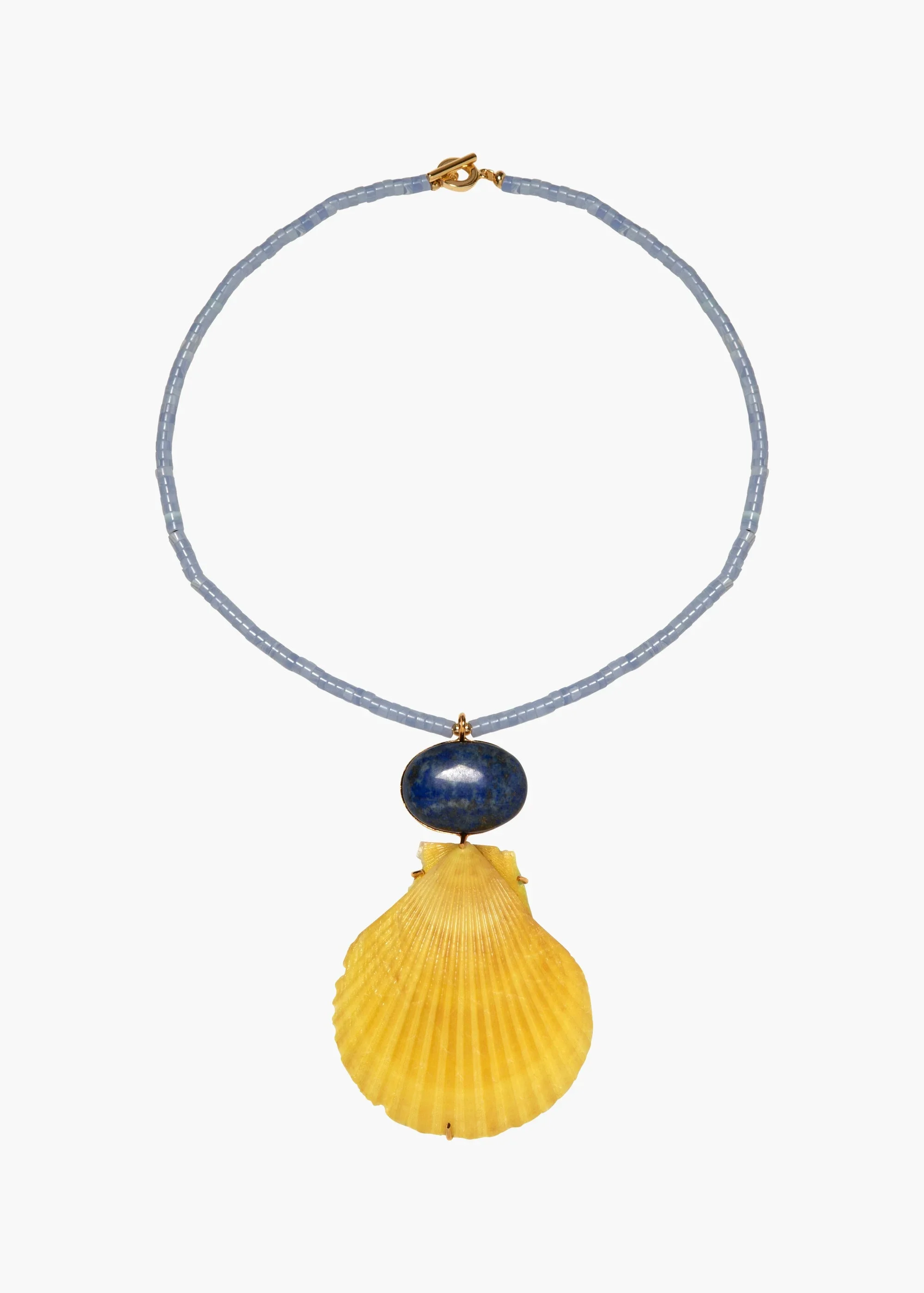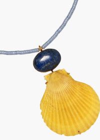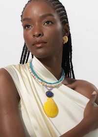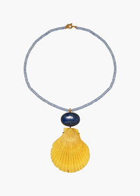 The Makana Necklace paints a striking palette with vibrant colors that are, astonishingly, naturally occurring. Hand-carved semi-precious blue chalcedony beads are graduated in size to form a single strand, with a semi-precious lapis lazuli accent stone. The genuine scallop seashell pendant is naturally yellow, complete with polished edges to rest comfortably against the neck, and a hand-formed setting that uses fine jewelry techniques. Dimensions: 16.5 inch length Material The Makana Necklace is handmade in New York of hand-carved semiprecious coral, citrine, or turquoise gemstones with a natural seashell and Czech crystal pendant, and 18K gold plated brass T-bar and loop clasp. All stones and shells have natural variances in color and markings that make each one unique. We recommend storing necklaces in their dust bag while not in use, and avoiding contact with water, perfume, hairspray, and other chemicals.
