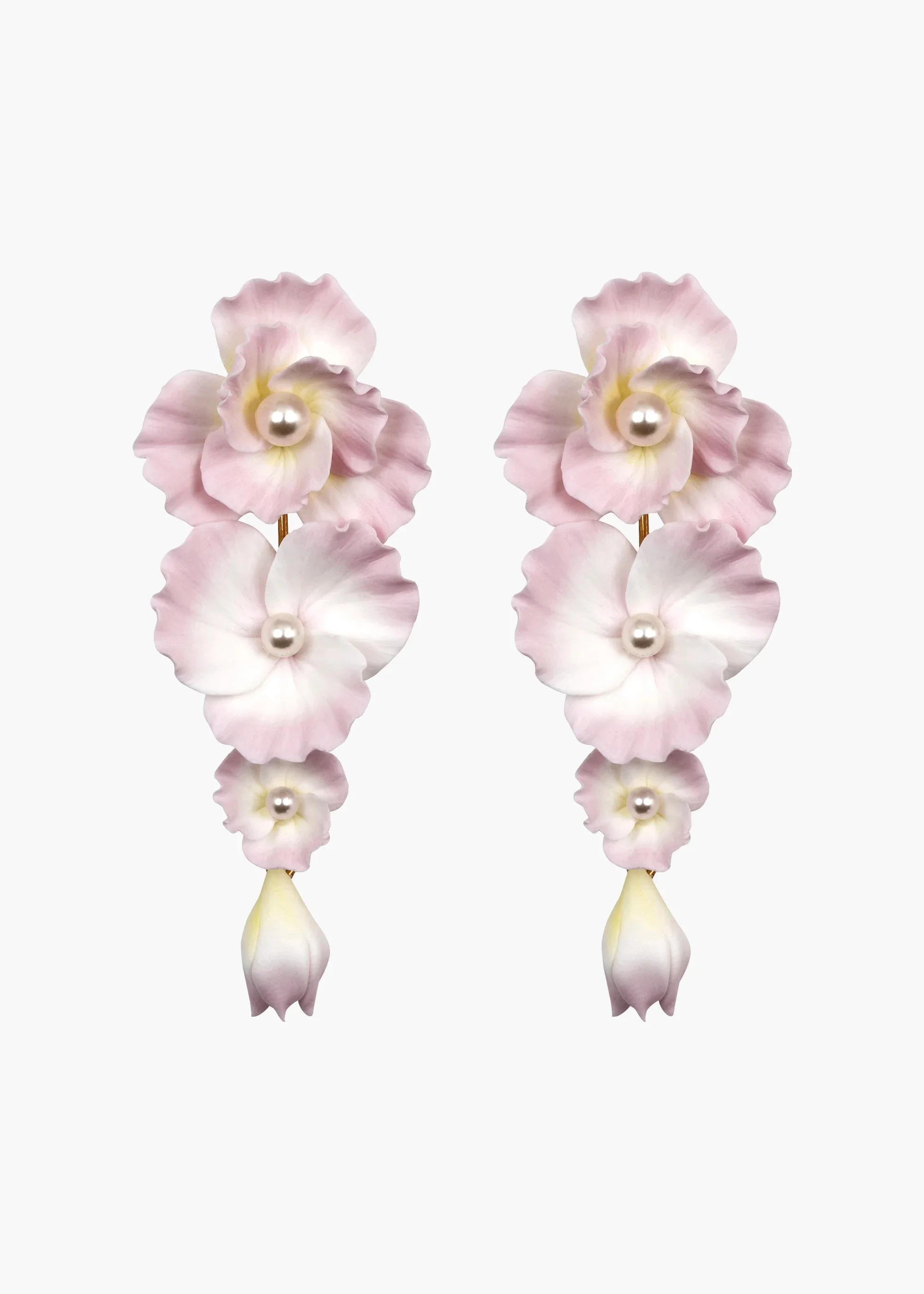 The Mariam Earrings come to life, courtesy of hand-pressed polymer clay flowers rendered with sculptural realism. Hand made in New York the petals' ridged surface feels carved by nature. Enhance the glowing pearl details by pairing these earrings with our signature pearl accessories. Dimensions: 2 7/8 in length, 1 in width. Material The Mariam Earrings are made by hand in New York from Ukrainian hand pressed polymer flowers with Czech crystal pearl centers. They have a surgical-steel post, are nickel-free, and safe for sensitive skin. We recommend storing earrings in their dust bag while not in use, and avoiding contact with water, perfume, hairspray, and other chemicals.