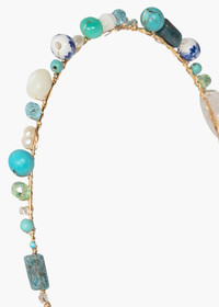 Inspired by shells collected by the sea, the Marietta Headband is a mixed-media medley, artistically combining seaglass, natural semi-precious gemstones, mother of pearl, handmade ceramic beads, and freshwater baroque pearl. Made by hand in New York, the adornment sits on an 18-karat gold-plated flexible headband base, so fine that it nearly disappears in the hair when worn, allowing the details to stand out. Layer multiple at a time for a bespoke statement. Height: 3/8 inch Detail length: 10 1/2 inch Material The Marietta Headband is made in New York of mixed seaglass, natural semi-precious stone, mother of pearl, freshwater baroque pearl, handmade ceramic beads, and imitation seashell embellishment on a 18K gold plated flexible steel base for weightless comfort. We recommend treating this headband as you would a piece of jewelry, and storing it in the dust bag when not in use. Avoid contact with water, perfume, and other chemicals, including hairspray, which should be used before placement in the hair.