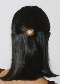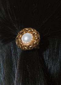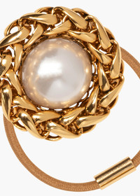 Inspired by our best-selling Marit Earrings, the Marit Ponywrap makes even the easiest styles feel intentional. It features an oversized pearl, encircled in a halo of hand-formed 18-karat gold-plated chains. The Japanese elastic has been carefully sourced for its strength and stretch. Dimensions: 1 3/8in x 1 3/8in Material The Marit Ponywrap is made by hand in New York from 18K gold plated brass and Austrian crystal pearls. We recommend treating this piece as you would a piece of jewelry, and storing in the dust bag when not in use. Avoid contact with water, perfume, and other chemicals, including hairspray, which should be used before placement in the hair.