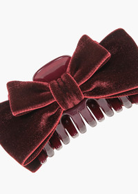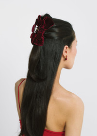 Our adored velvet bow just received the jaw-clip treatment: the Matilda Jaw Clip is the accessory you don't want to run out the door without. Luxe velvet ribbon forms graduating layers of bows, for dimension and volume. These delicious bows sit on a sturdy acrylic resin jaw clip, making it easy to sweep hair half-up, all the way back, and into any style in between. Material The Matilda Jaw Clip is made by hand in New York of velvet ribbon, with an acrylic resin claw clip. We recommend treating this clip as you would a piece of jewelry, and storing in the dust bag when not in use. Avoid contact with water, perfume, and other chemicals, including hairspray, which should be used before placement in the hair.