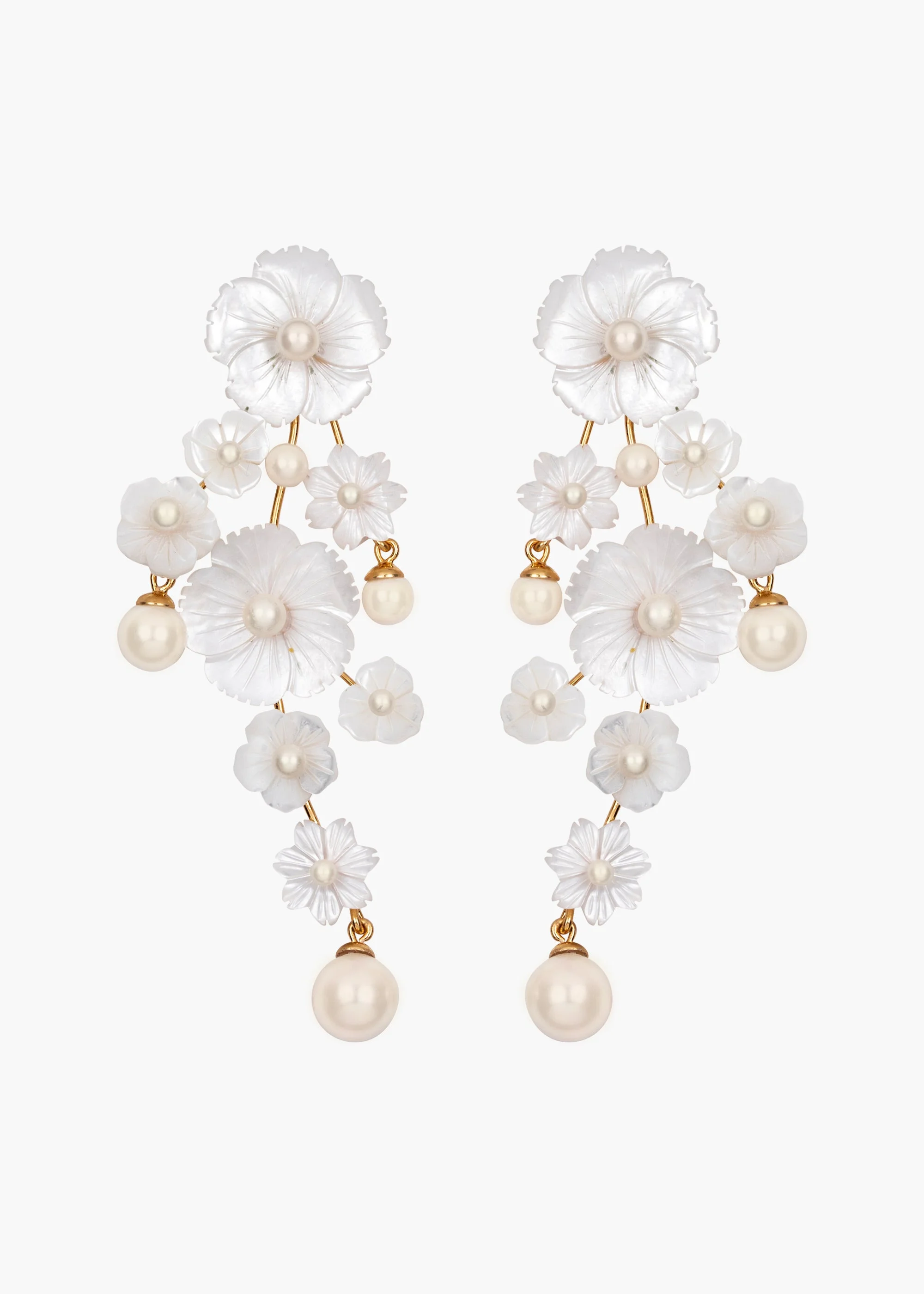 With an organic arrangement reminiscent of a bouquet of flowers, the Maxine Earrings are thoughtfully designed to compliment the lines of your face. Crafted of mother of pearl, a material we love for its soulful depth and inimitable luster, each flower is carved by hand, and, in a laborious process, hand-soldered and hand-set with pearl details at each flower's center. The look is complete with multiple dangling pearls, which create movement reminiscent of lilies of the valley swaying in the breeze. Dimensions: 3.5" length. Material The Maxine Earrings are made by hand in New York from 18K gold plated brass and mother of pearl flowers. They have a surgical-steel post, are nickel-free, and safe for sensitive skin. We recommend storing earrings in their dust bag while not in use, and avoiding contact with water, perfume, hairspray, and other chemicals.