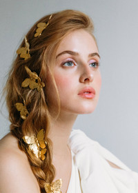 The Mazarine Bobby Pin, featuring golden butterflies with intricate carved details, is our version of the best-selling Papillon Earring for your hair. This modern take on a nostalgia-inducing butterfly clip is sophisticated enough to wear anywhere. The versatility of the classic bobby pin closure means you can wear it solo to clip back hair in the front, or as a part of a more elaborate style. Dimensions: 2.5 x 2 inches Weight: 10g Material The Mazarine Bobby Pin is made in New York of gold-tone plated brass embellishment, on a durable steel bobby pin, which is designed to stay firmly in place, once other pins have the hairstyle securely fastened. We recommend treating each pin as you would a piece of jewelry, and storing in the dust bag when not in use. Avoid contact with water, perfume, and other chemicals, including hairspray, which should be used before placement in the hair.